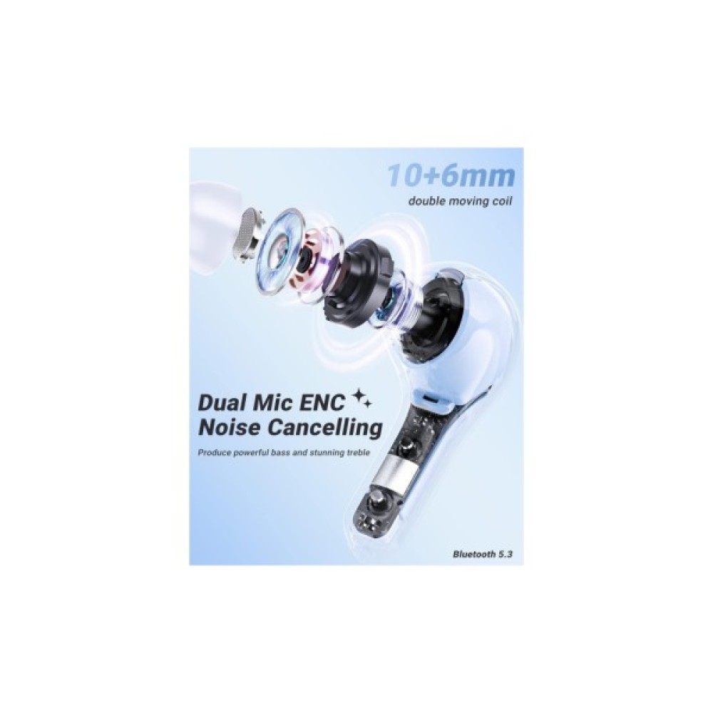 Бездротове підключення за допомогою новітньої технології Bluetooth 5.3 надає стабільний сигнал навіть на відстані до 10 метрів. Інноваційна LDS антена забезпечує відмінну передачу сигналу без перешкод, що надзвичайно важливо для активних користувачів телефоном чи ноутбуком. Унікальність цих навушників полягає в системі активного шумозаглушення: подвійні мікрофони разом із технологією шумозаглушення SVE AI ефективно відсіюють навколишній шум, гарантуючи чітке спілкування та сприйняття звуку навіть у шумному середовищі.