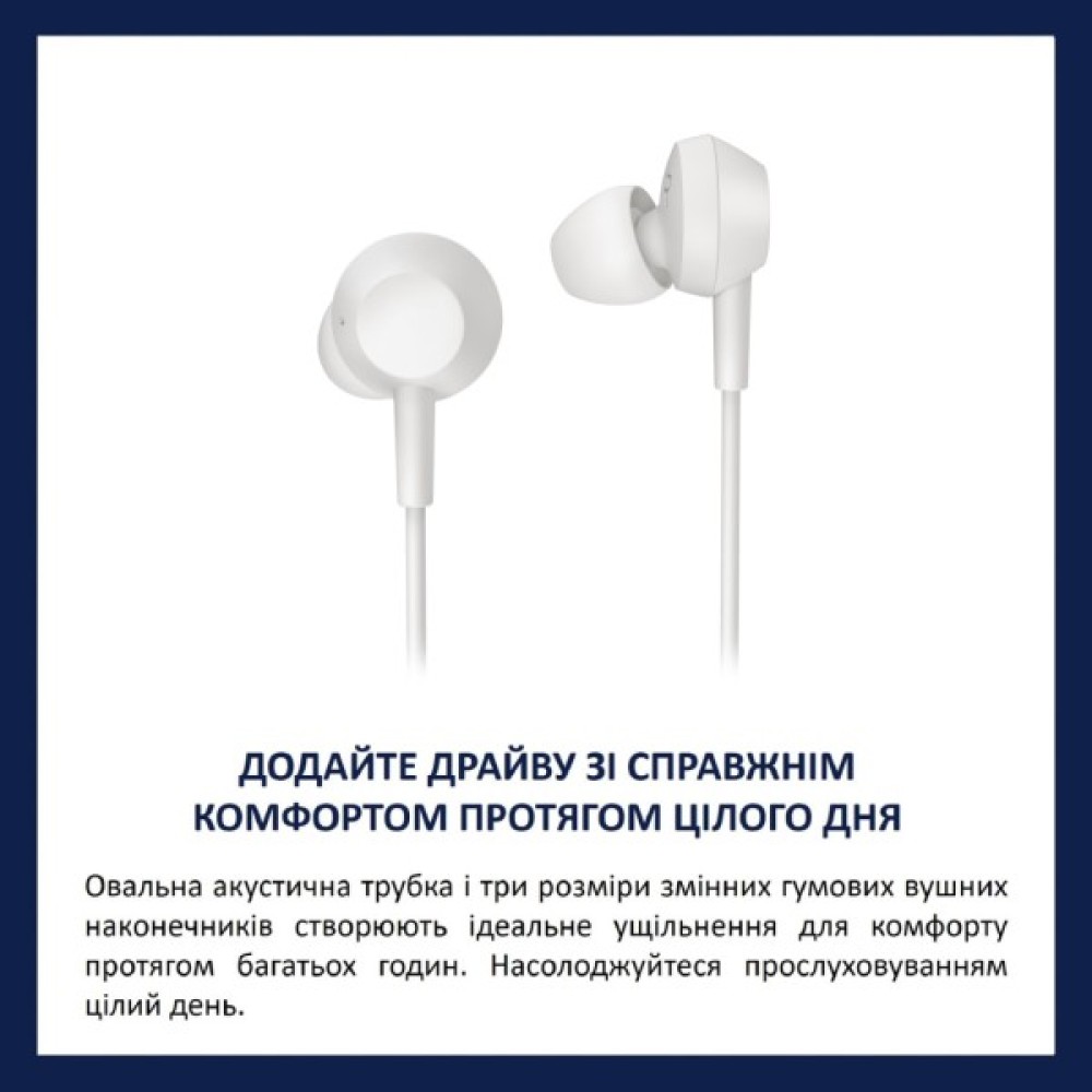 Додайте драйву зі справжнім комфортом протягом цілого дняОвальна акустична трубка і три розміри змінних гумових вушних наконечників створюють ідеальне ущільнення для комфорту протягом багатьох годин. Насолоджуйтеся прослуховуванням цілий день.