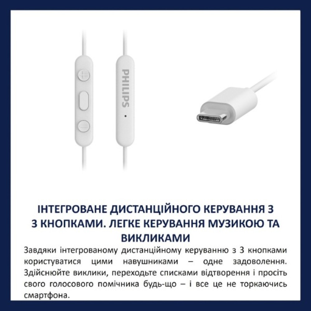 Інтегроване дистанційного керування з 3 кнопками. Легке керування музикою та викликамиЗавдяки інтегрованому дистанційному керуванню з 3 кнопками користуватися цими навушниками – одне задоволення. Здійснюйте виклики, переходьте списками відтворення і просіть свого голосового помічника будь-що – і все це не торкаючись смартфона.