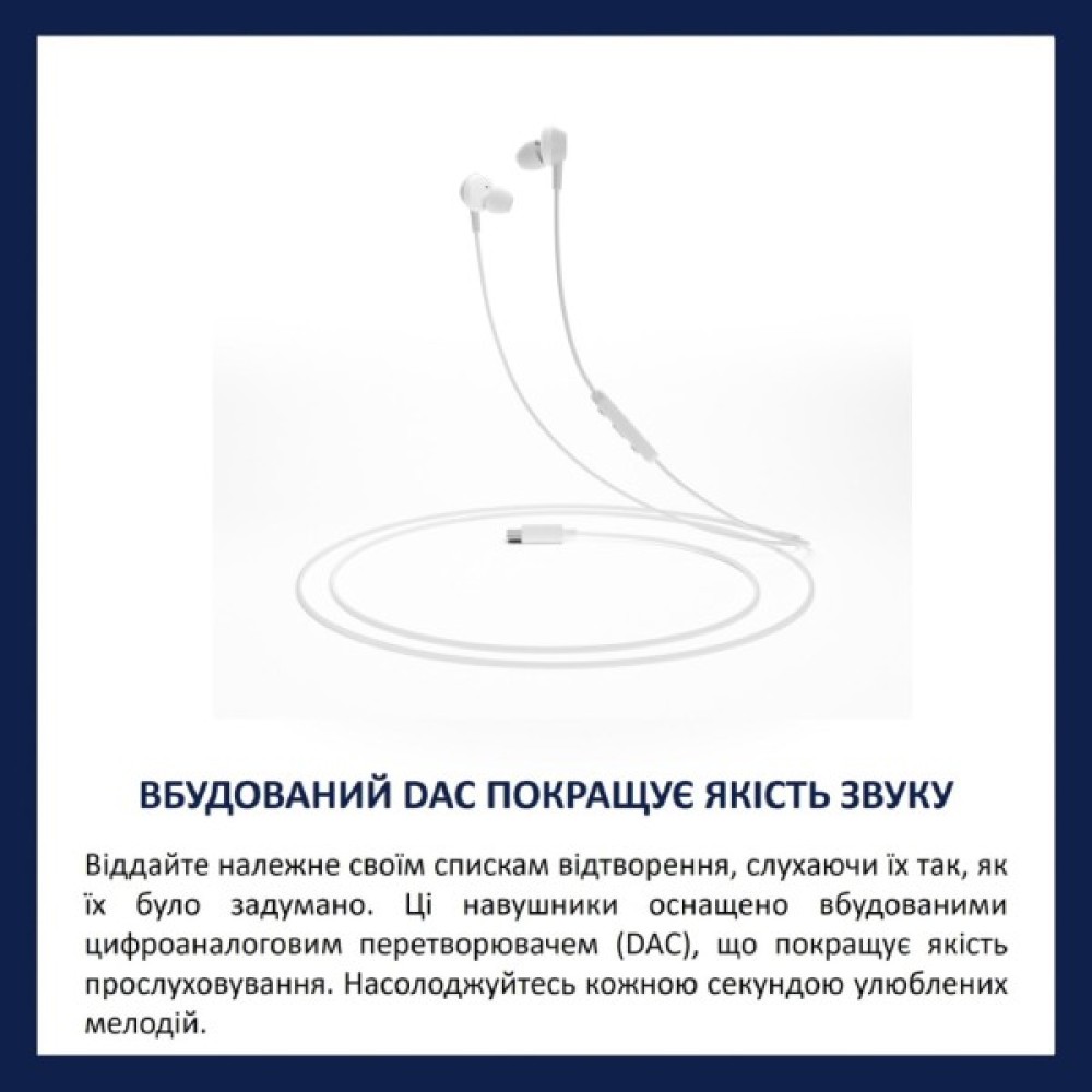 1,2-м кабель із конектором USB-CПросто під’єднайте кабель до роз’ємів USB-C без адаптера перетворення. Навушники можна під’єднати до будь-якого смартфона, планшета або ПК з інтерфейсом USB-C.