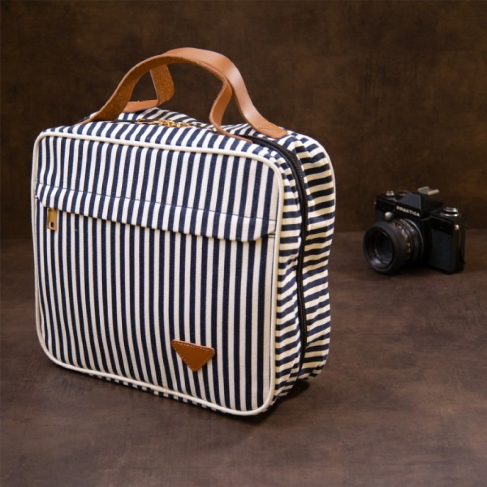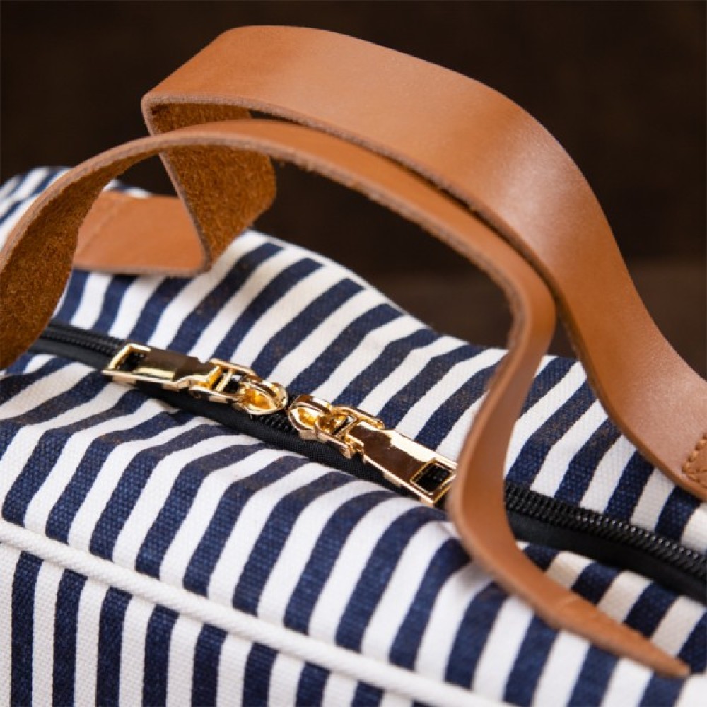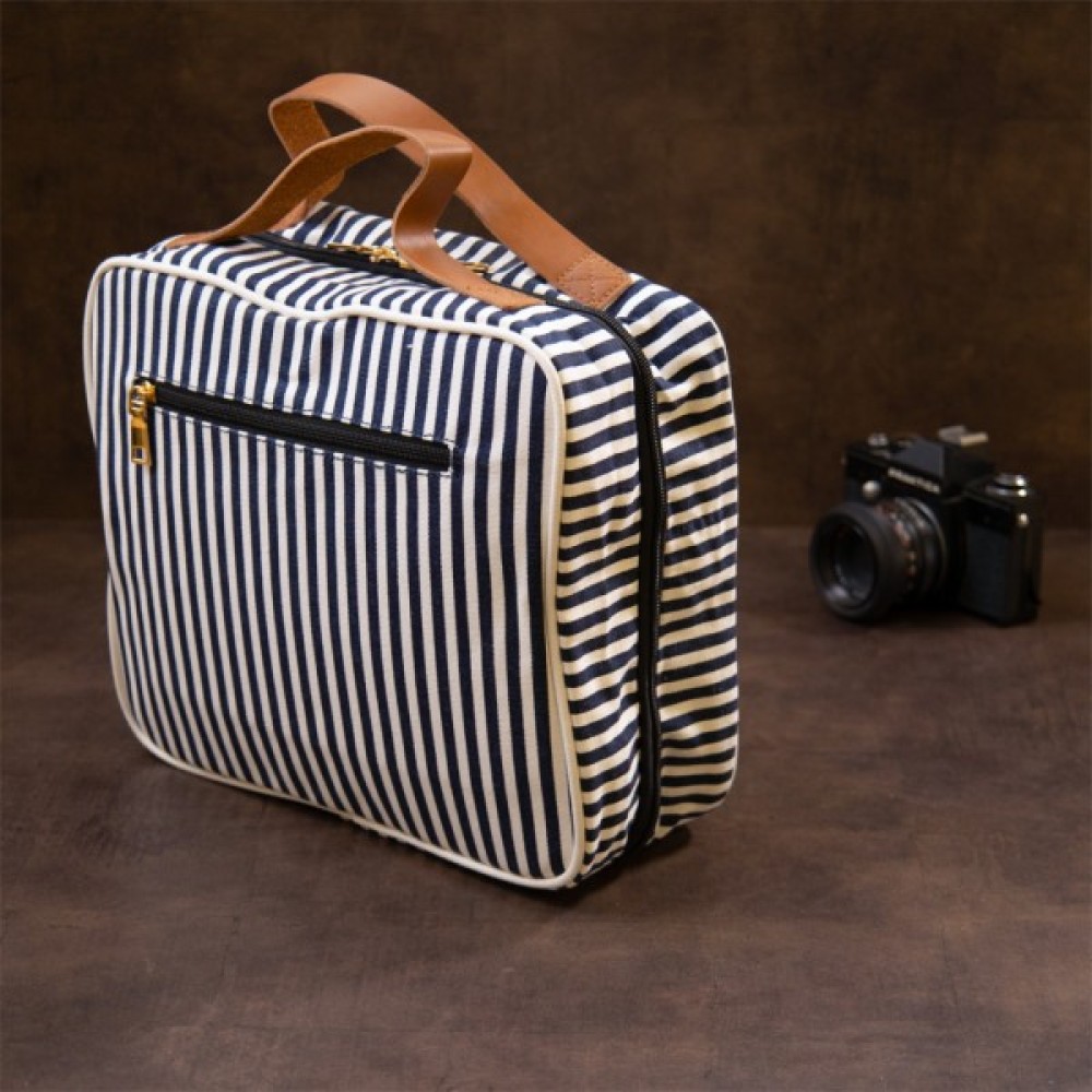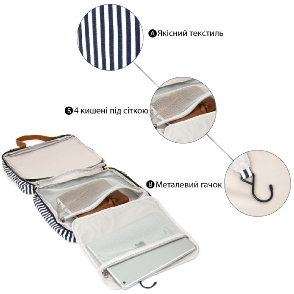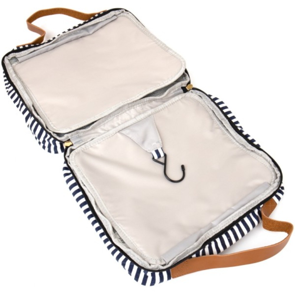 Сумка закривається на блискавку. Виріб можна підвісити за допомогою гачка. Модель має дизайн у синю смужку.