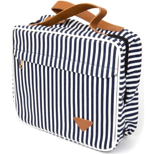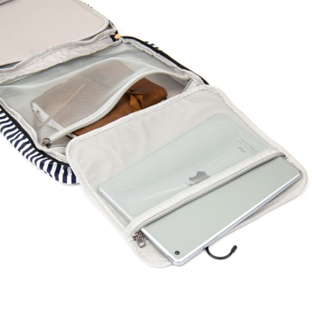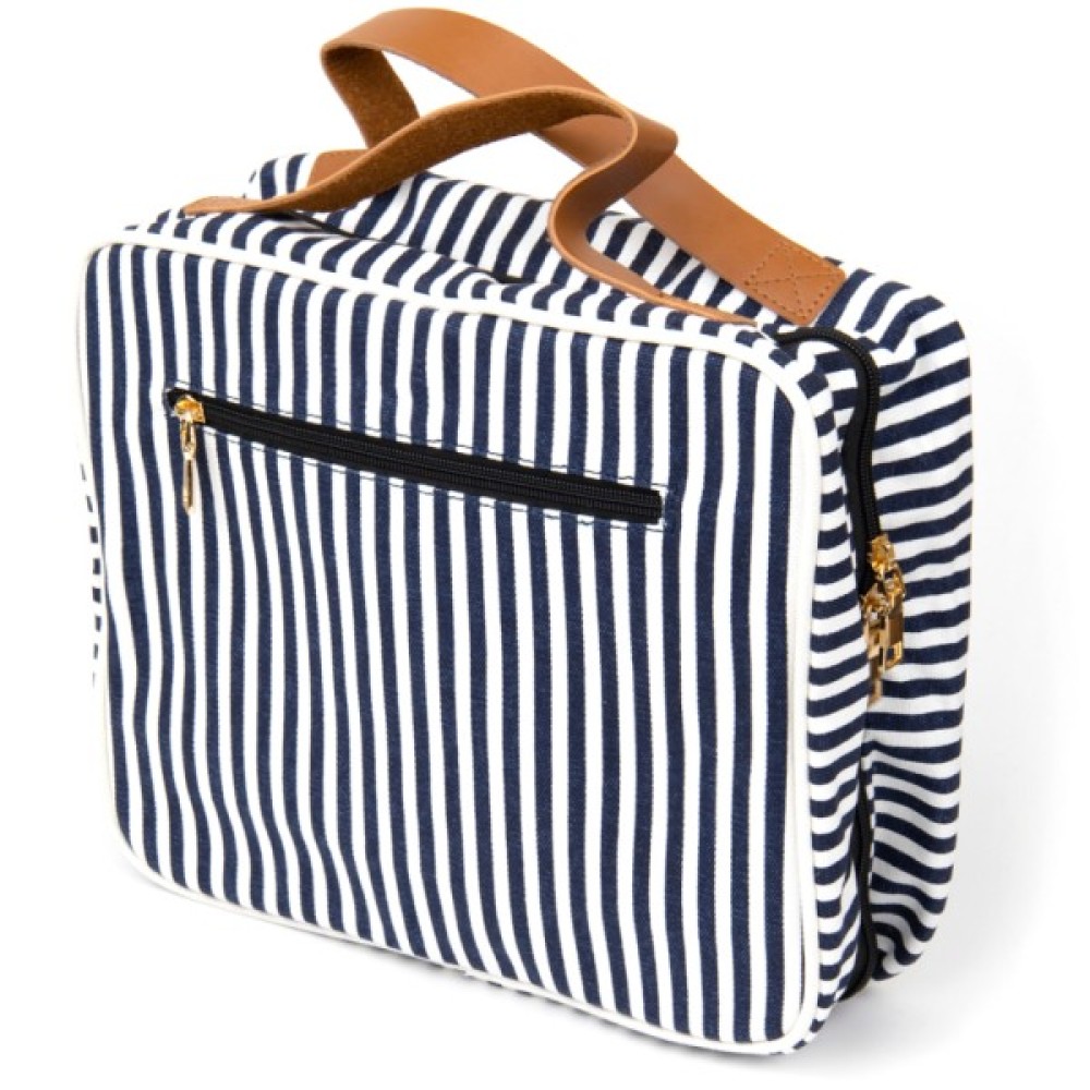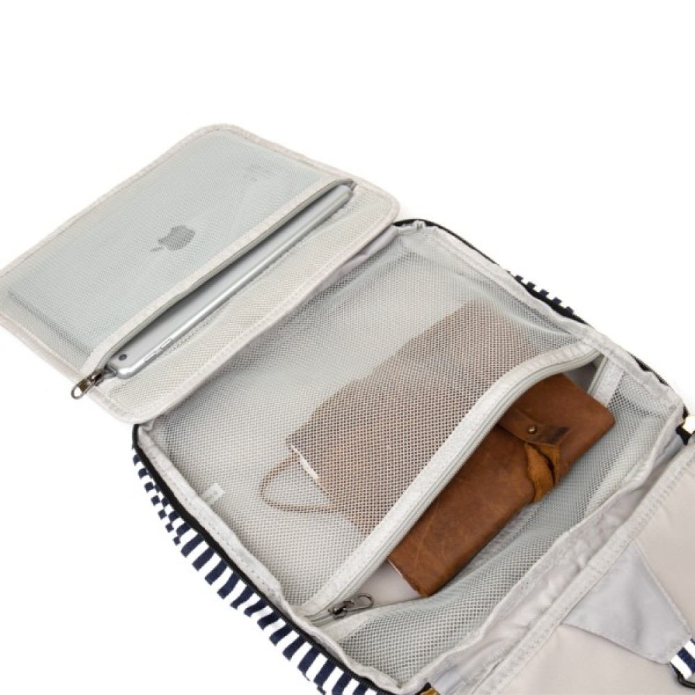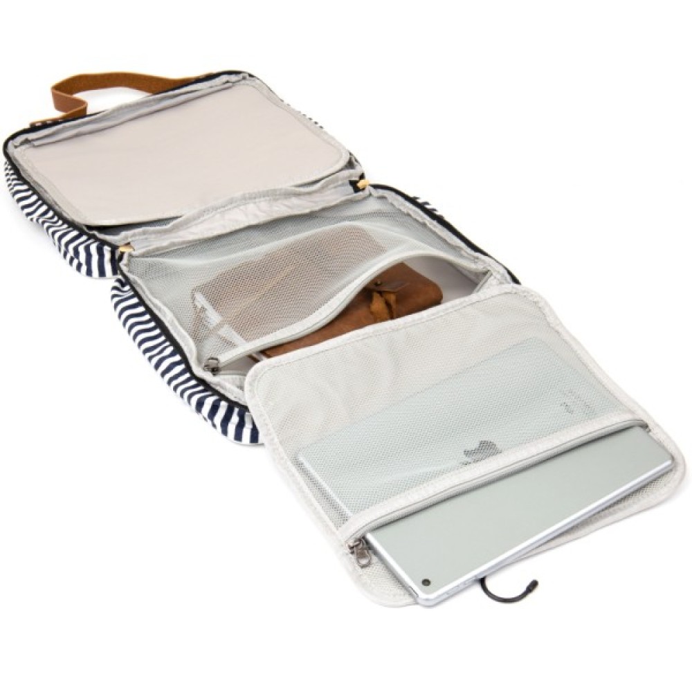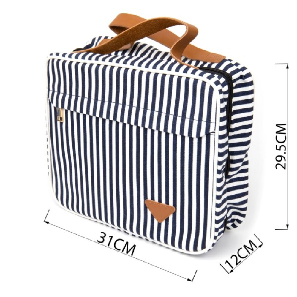 Сумка закривається на блискавку. Виріб можна підвісити за допомогою гачка. Модель має дизайн у синю смужку.