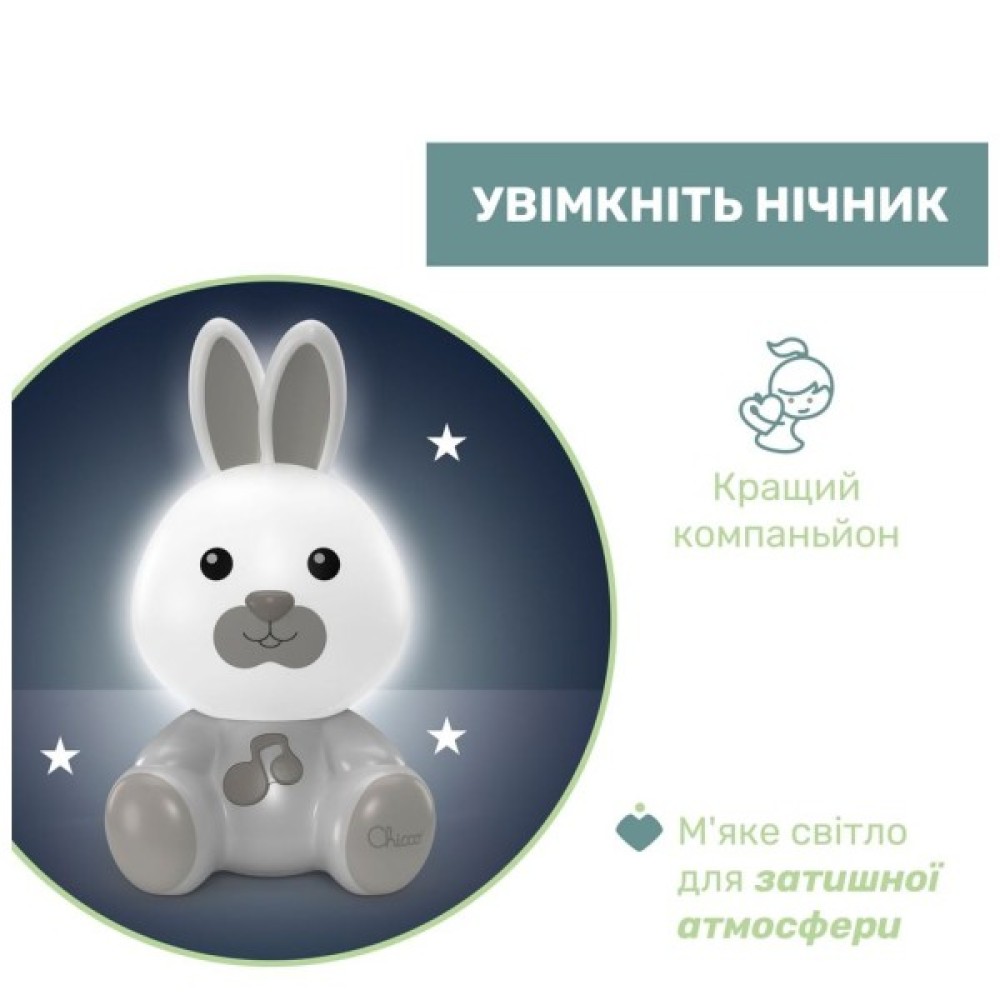 Іграшка Кролик Dreamlight від Chicco — це нічник і переносний світильник 2 в 1 зі звуковими ефектами. Кролик Dreamlight стане найкращим другом малюка в темну пору доби, створюючи спокійну та затишну атмосферу в дитячій кімнаті.