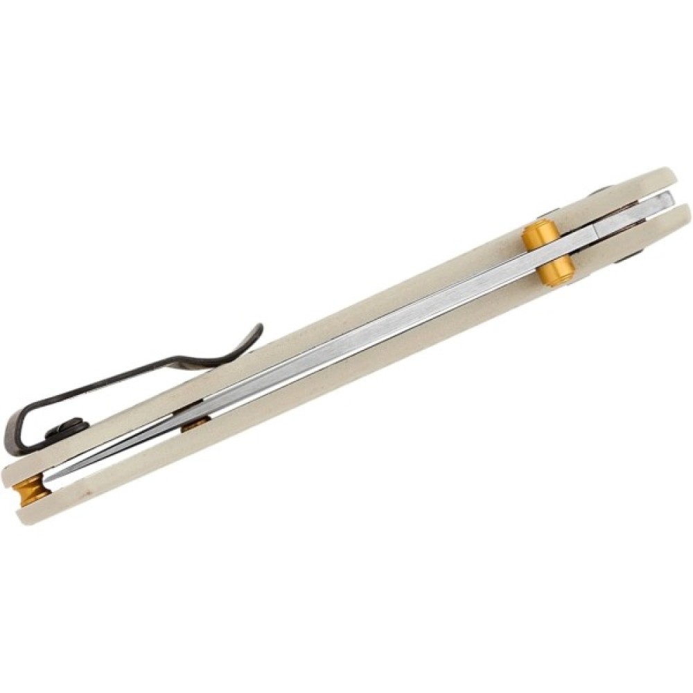 Розкриття ножа здійснюється за допомогою двостороннього анодованого в блакитний колір шпенька, а надійну фіксацію забезпечує розроблений та запатентований компанією Benchmade замок AXIS. Зручна рукоять пісочного кольору з полімеру Grivory здатна витримувати високі температури і має велику міцність. Плашки текстуровані для кращого захоплення під час роботи. Крім того, ніж буде зручним як правшам, так і лівшам, т.к. виробник дозволяє переставляти кліпсу. Як доповнення в основі рукояті розташований досить великий отвір для темляка.