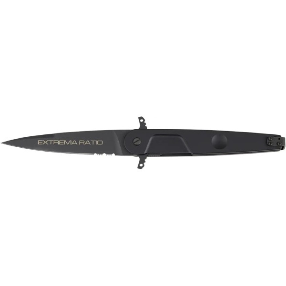 Фіксується у відкритому положенні сталевим замком Liner Lock з однією пластиною для полегшення ваги та більшої зручності в обслуговуванні. Але це не зменшує міцність загальної конструкції, так як накладки на руків’ї виконані з алюмінієвого сплаву Anticorodal вищого ступеня очищення. Цей матеріал має неймовірну стійкість до корозії, надзвичайно міцний і витримає найважчу роботу. Ергономічна форма руків’я, розроблена за унікальною технологією ERMH (Extrema Ratio Multipurpose Handle), що базується на принципах кінезіології, комфортно лягає в руку. Також передбачена велика підпальцева виїмка для зворотного хвату. Для зручності носіння встановлена двостороння кліпса глибокої посадки.