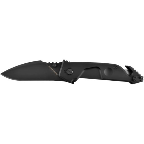 Широкий клинок профілю Drop Point наділяє ніж відмінними колючими і різальними якостями, а легована кобальтом сталь Böhler N690 твердістю 58 HRC добре витримує інтенсивні навантаження, у тому числі і поперечні. Фінішне покриття клинка Black Oxide MIL-C-13924 чудово захищає від корозії і може змінюватись в залежності від моделі: чисто чорне або з лазерним гравіюванням у вигляді маскувальних смуг. Для комфорту та впевненості під час використання, на обусі розміщений ряд масивних насічок для упору великим пальцем. Приводиться в робоче положення як лівою, так і правою рукою, за допомогою двостороннього шпеника. Фіксується у відкритому вигляді за допомогою надійного замка Liner Lock. Extrema Ratio подбала про безпеку і для запобігання випадкового відкриття був встановлений запобіжник, який надійно фіксує клинок у відкритому або закритому положенні. Також лінійка MF отримала нововведення – регулювальний осьовий гвинт, завдяки якому можна відрегулювати плавність виходу клинка.