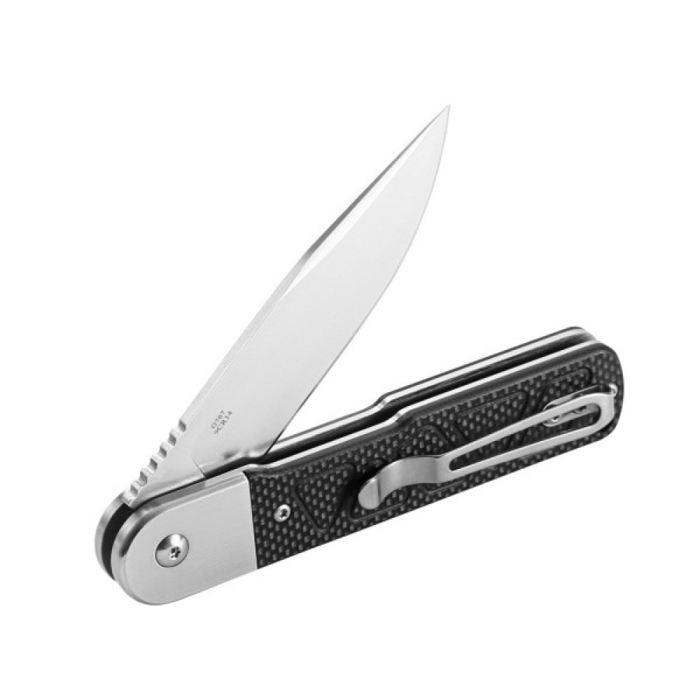 Матеріал клинка — сталь 9CR14, яка рідко зустрічається у складаних інструментах Ganzo. Це нержавіюча марка з високим вмістом хрому та допоміжними легувальними елементами у вигляді молібдену та ванадію, що знижують крихкість та підвищують щільність металу. Твердість сталі дорівнює еталонним 59 HRC, тому клинок ефективно справляється з різанням матеріалів різної щільності.