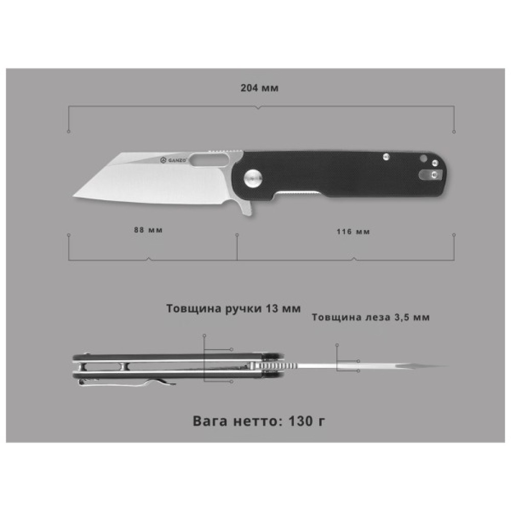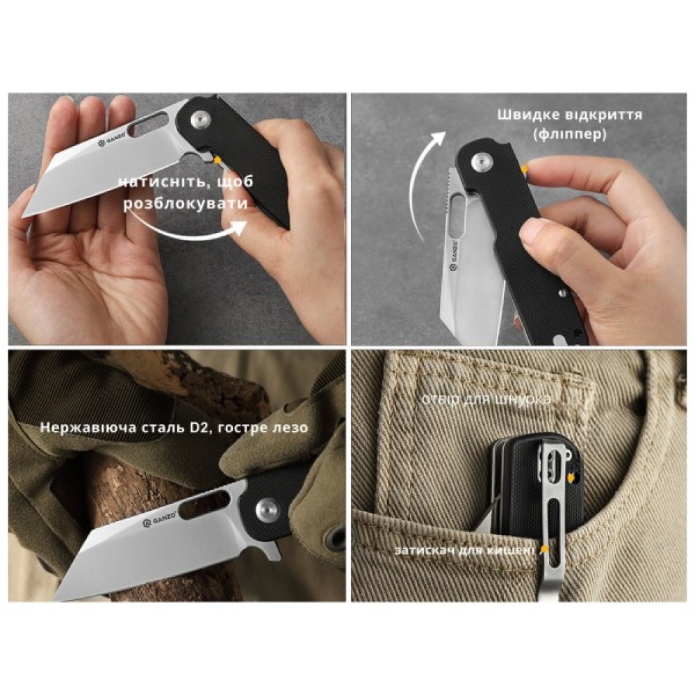 Ніж Ganzo G770 — компактний універсал в асортименті складаних інструментів Ganzo. Різати, пиляти, проколювати та надрізати — модель справляється з будь-яким завданням з однаковою ефективністю завдяки клинку з профілем wharncliffe, що має подовжену різальну кромку та загострений кінчик для тонких робіт.