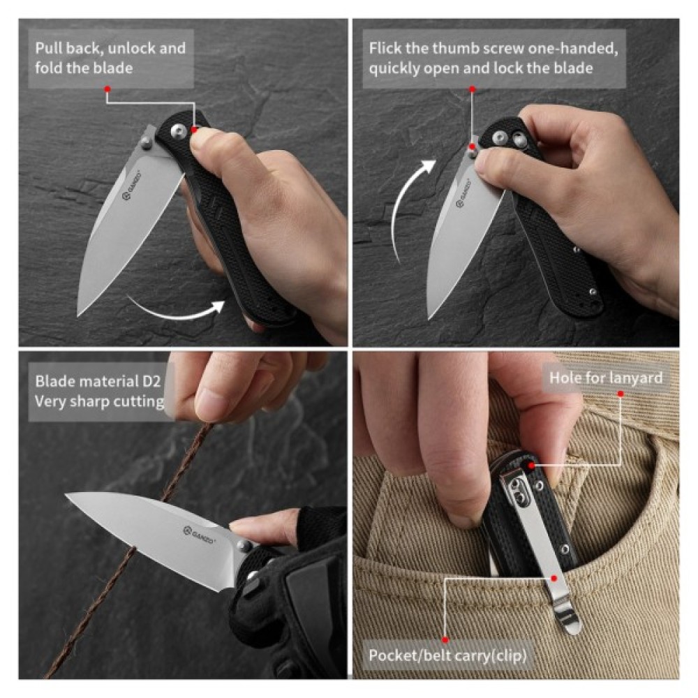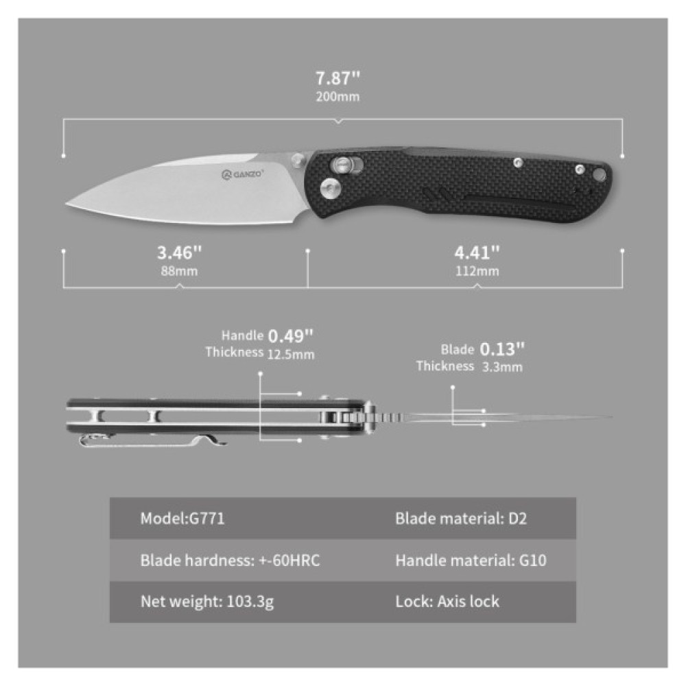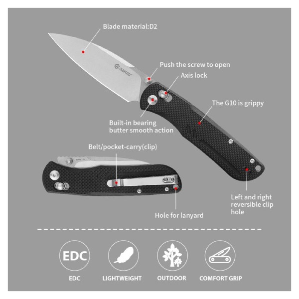 У ножі Ganzo G771 поєднуються універсальність EDC-моделі та стриманий стиль, характерний для інструментів бренду. Завдяки класичному клинку Drop Point ніж покриває всі базові потреби з різання — від побутових завдань, як розкриття паковань, до підготовки гілок для розпалювання багаття на природі.
