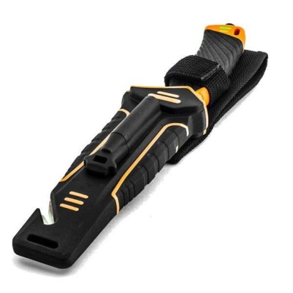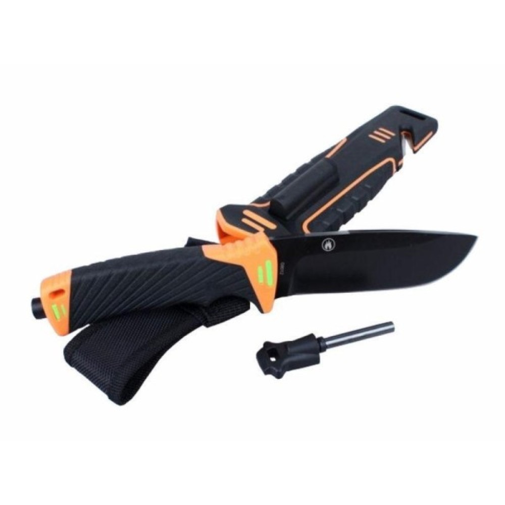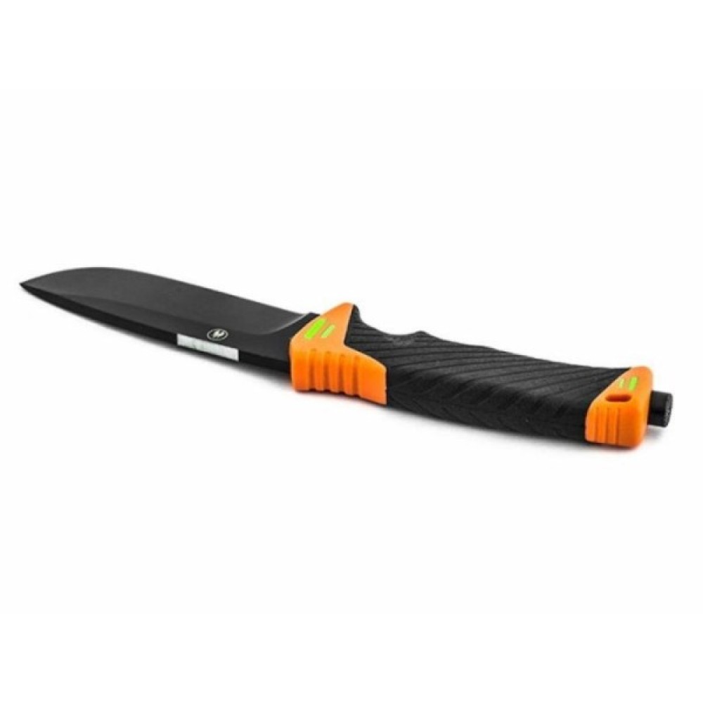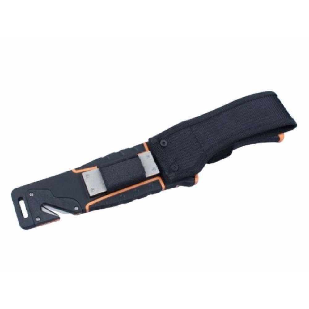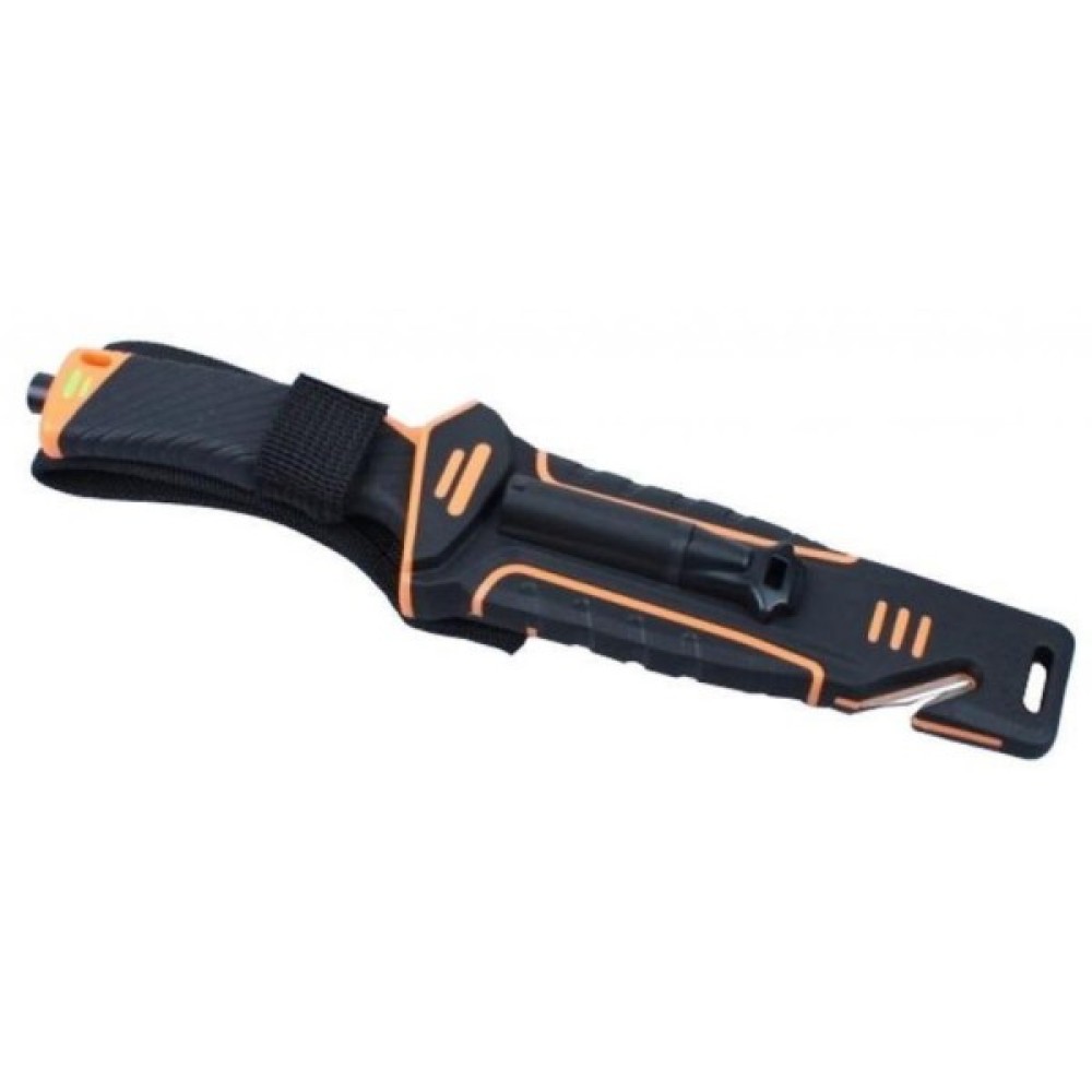 Дуже важливий елемент у цій моделі — чохол для ножа. Він зроблений з пластику та нейлону, а тому відмінно захистить і ножа від пошкоджень, і власника ножа від випадкових поранень або псування іншого спорядження. З тильної сторони чохла вбудована точилка з алмазним напиленням, яка допоможе відновити гостроту гладко заточеної ділянки. Крім того, в чохлі є стропоріз, а із зворотного від точила боку вбудовано кресало, яке можна вийняти і використовувати самостійно.