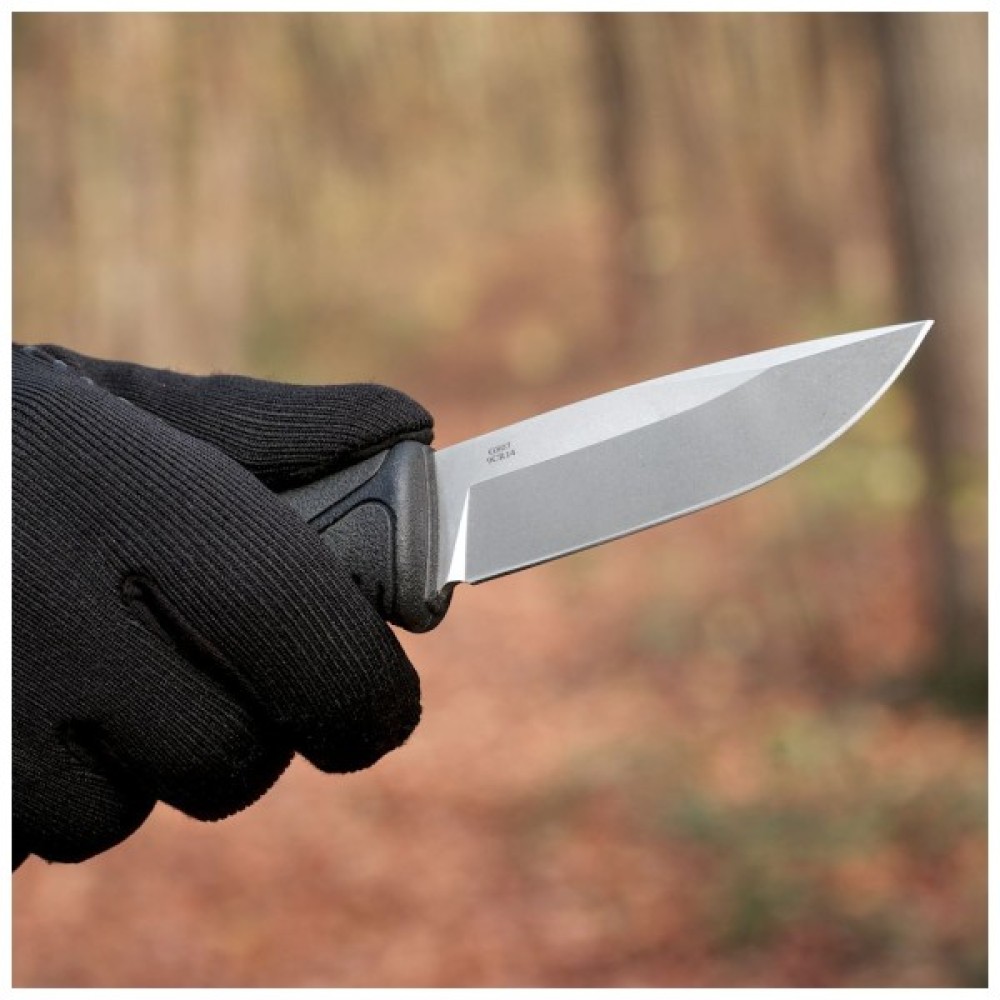 • клинок Drop Point виготовлений із вуглецевої сталі 9CR14;