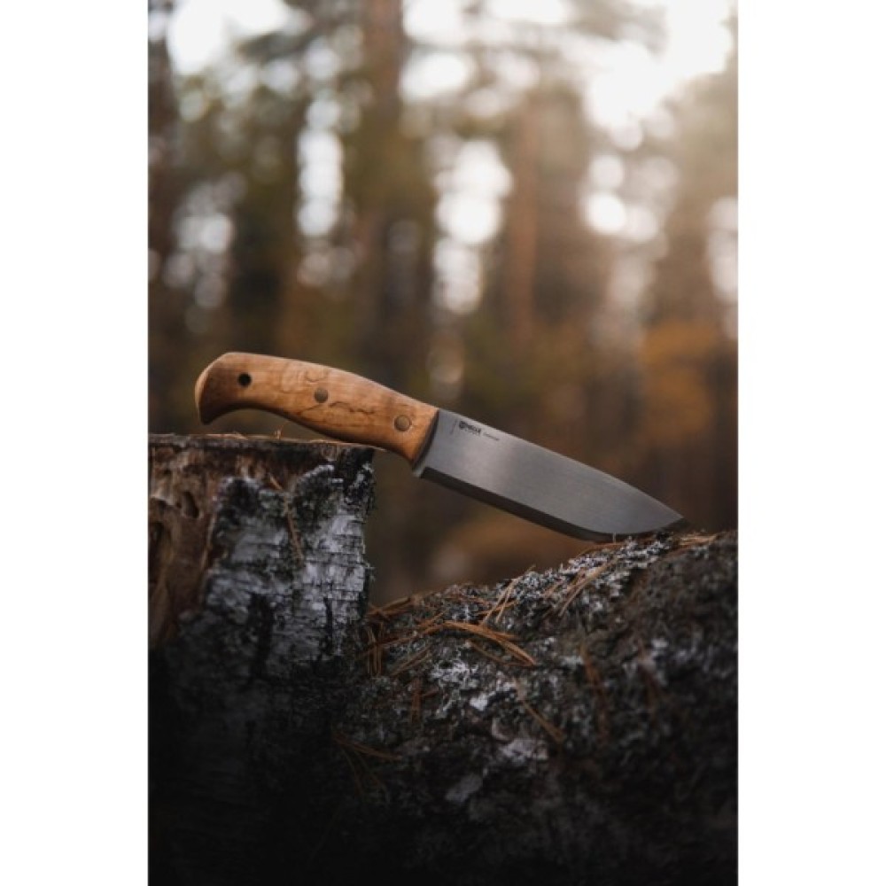 Helle Nord - ніж створений для серйозних польових умов. Клинок завдовжки 14,7 см у профілі Drop Point виконаний зі стійкої до корозії нержавіючої сталі Sandvik 14C28N . Прямі кути обуха ідеальні для нанесення ударів по феростержню для висікання іскри.