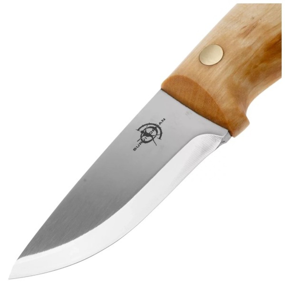 • Полірований дроп-пойнт клинок із інструментальної сталі Uddeholm Sleipner зі скандинавським заточуванням ріжучої кромки - характеризується високими показниками різа, відмінно працює з матеріалами різної щільності, надійно захищений від негативного впливу зовнішніх факторів, впевнено витримує інтенсивні навантаження і не потребує частого заточування;