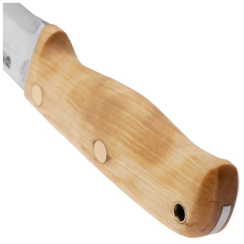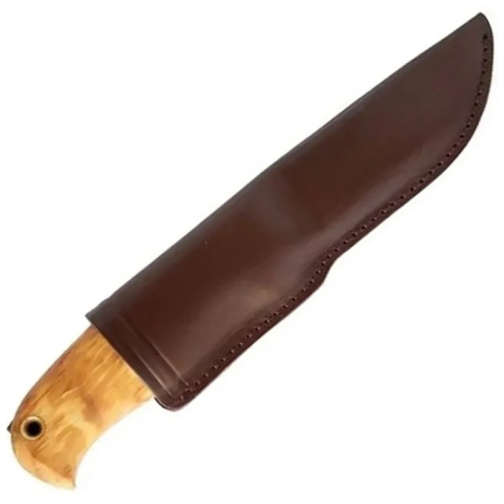 • Товсте руків`я бочкоподібної форми із цільного масиву деревини карельської берези з ручною обробкою поверхні (шліфування, полірування, просочування маслом), захисною гардою (спеціальний виступ, який перешкоджає випадковому зісковзування руки) і великим отвором для темляка/паракорду - легке та міцне, тактильно приємне та комфортне для руки навіть у морозну погоду , надійно фіксується при різних хватах, дозволяє повноцінно контролювати роботу клинка, стійке до навантажень;