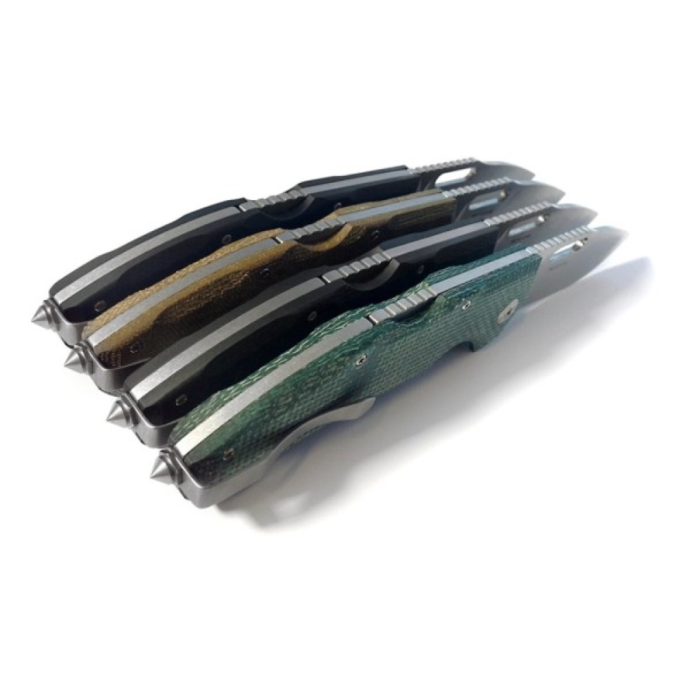 Різні варіанти руків’їв: Carbon Fiber, G10 (чорний), Micarta (зелена, “desert tan”) — дають змогу вибрати за стилем і призначенням.