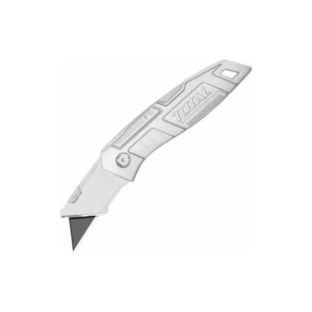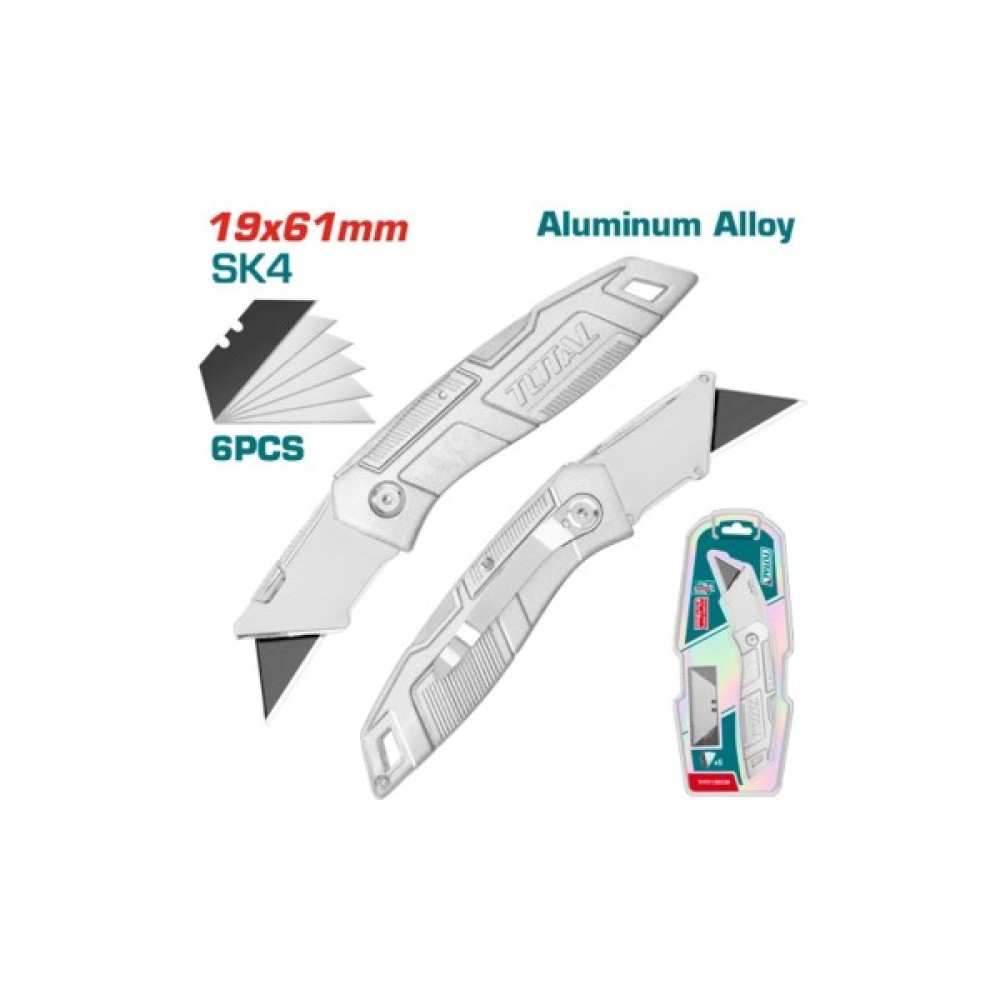 Ніж складний універсальний TOTAL THT5136236 використовується при виконанні будівельних і господарських робіт для різання нетвердих матеріалів таких як папір, картон, лінолеум, гума, шпалери. Корпус ножа із алюмінієвого сплаву. Ніж має лезо у формі трапеції 61х19 мм. У комплекті п'ять трапецієподібних лез.