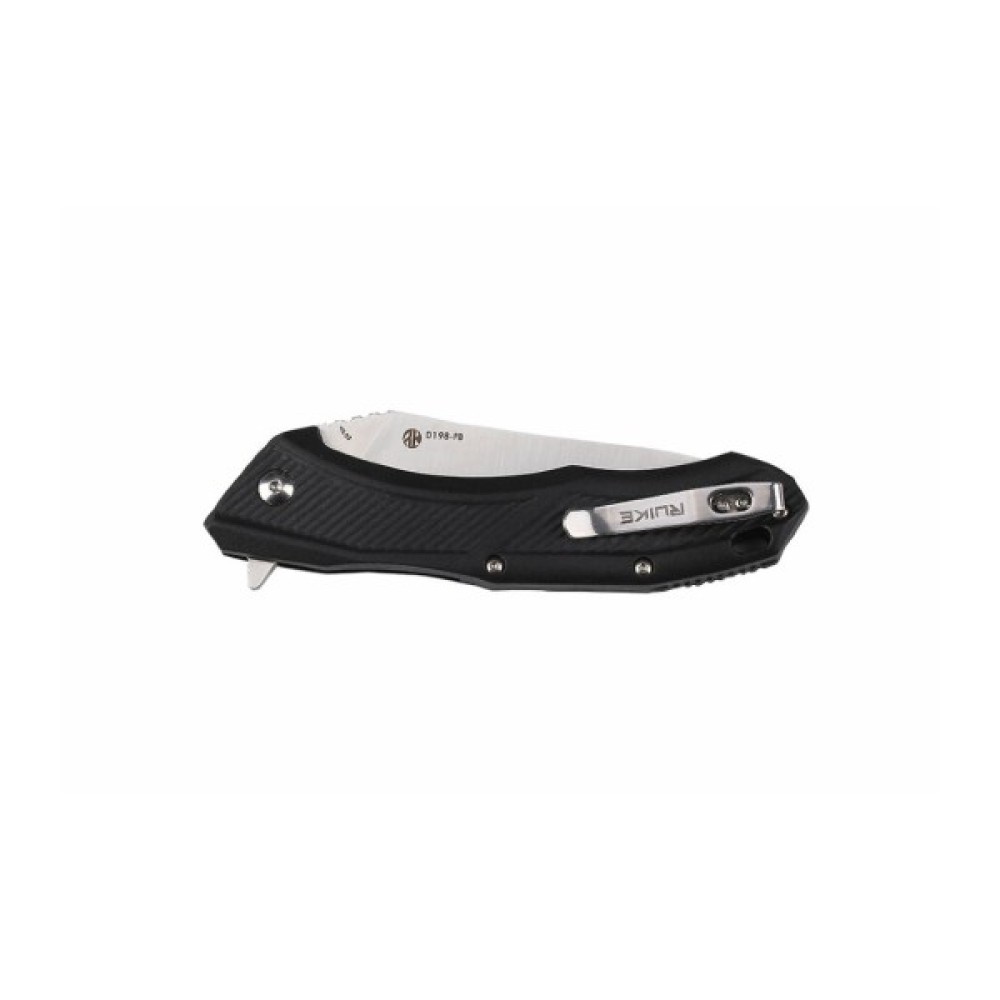 Модель Ruike D198-PB має ергономічну ручку зі зручними виїмками під пальці. Вона виготовлена ​​з матеріалу PA66 – це особливо міцний поліамід, який витримує вплив високих температур та падіння з висоти. Поверхня рукояті частково має хвилясту поверхню, яка покращує хват при утриманні ножа у мокрій долоні. Для комфортного носіння виробник передбачив можливість фіксації ножа на одязі за допомогою тугої металевої кліпси. У разі потреби користувач може самостійно зняти кліпсу з ножа, відкрутивши два гвинти, що фіксують.