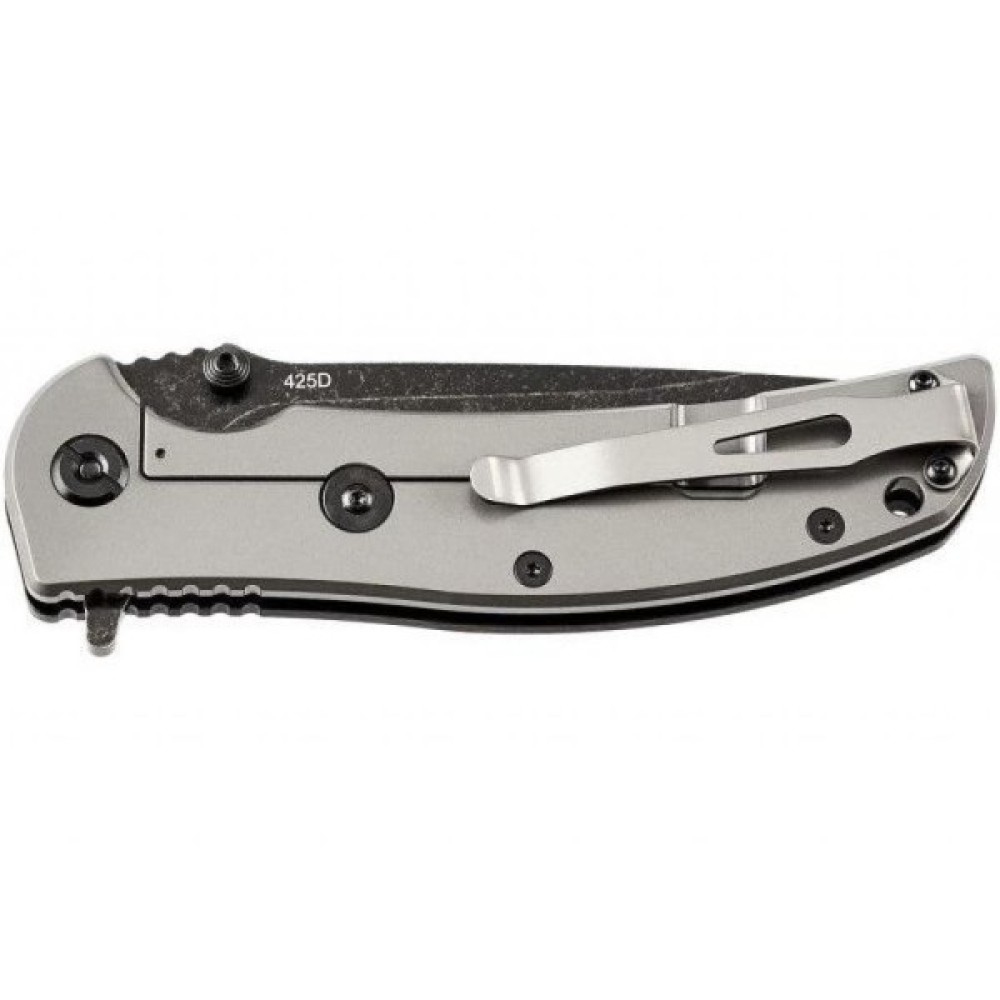 Прямі спуски починаються практично з самого обуха, на верхній його частині присутня насічка під великий палець. Форма клинка - Drop-Point, яка забезпечує ножу хороші колючі і ріжучі властивості.
