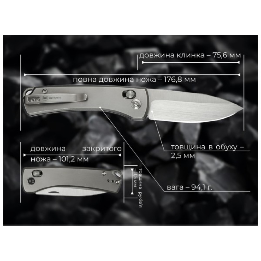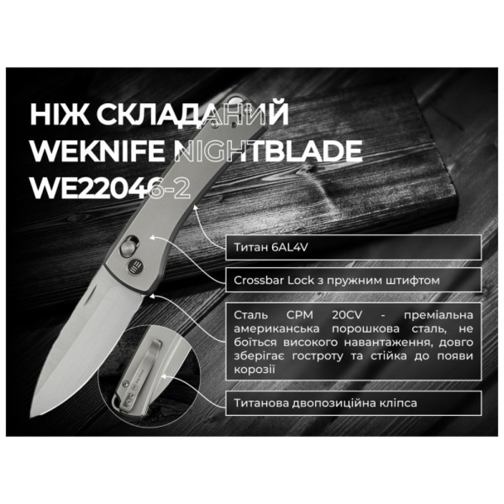 Weknife Nightblade легко відкривається та закривається завдяки кульковим керамічним підшипникам в осьовому вузлі. Титанова кліпса полегшує носіння на кишені, щільно фіксуючи інструмент без ризику його втрати. У хвості є наскрізний отвір для страхувального темляка або декоративного паракорда.