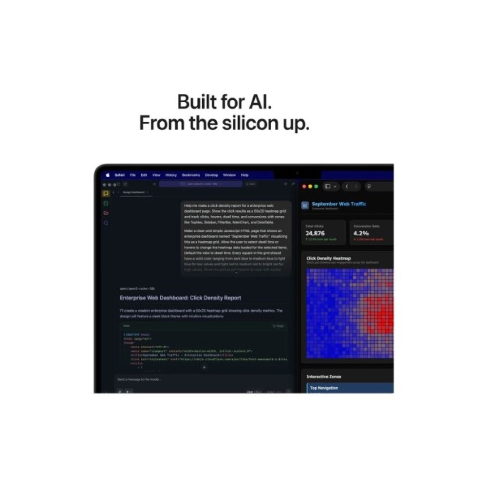 Apple silicon та кожна ключова підсистема, яка його забезпечує, розроблені з урахуванням AI — створюючи платформу, що повністю об’єднує апаратне забезпечення, програмне забезпечення та екосистему. Тому ви можете запускати складні AI-завдання безпосередньо на пристрої з неймовірною енергоефективністю. І, як завжди, безпека та конфіденційність закладені в основу, а не додані пізніше.