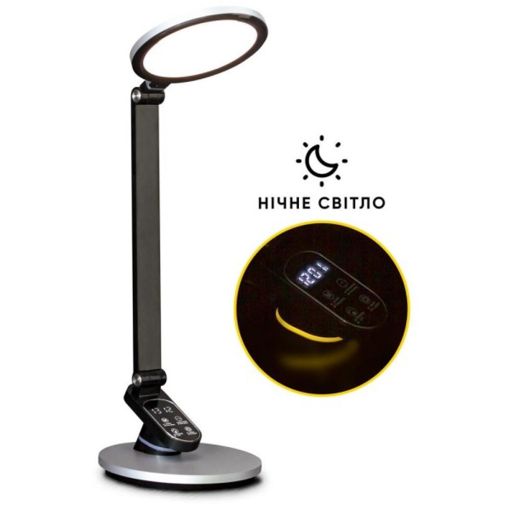 Налаштування лампи здійснюється за допомогою сенсорної панелі, на якій розташовані кнопки режиму освітлення та рівня яскравості, а також встановлення електронного годинника та таймера автоматичного вимикання лампи. Лампа має три режими освітлення: тепле, холодне та нейтральне світло (для навчання та роботи). Правильно вибраний режим і рівень яскравості допоможуть зберегти зір дитини. Рухомий корпус та плафон допоможуть правильно налаштувати світловий потік та створять необхідний кут світла на робочій поверхні. Корпус лампи виготовлений із якісного комбінованого та безпечного пластику. Він підсвічується теплим світлом, якщо натиснути кнопку On/Off і потримати її 1 с. Лампа працює від електромережі, блок живлення входить до комплекту.