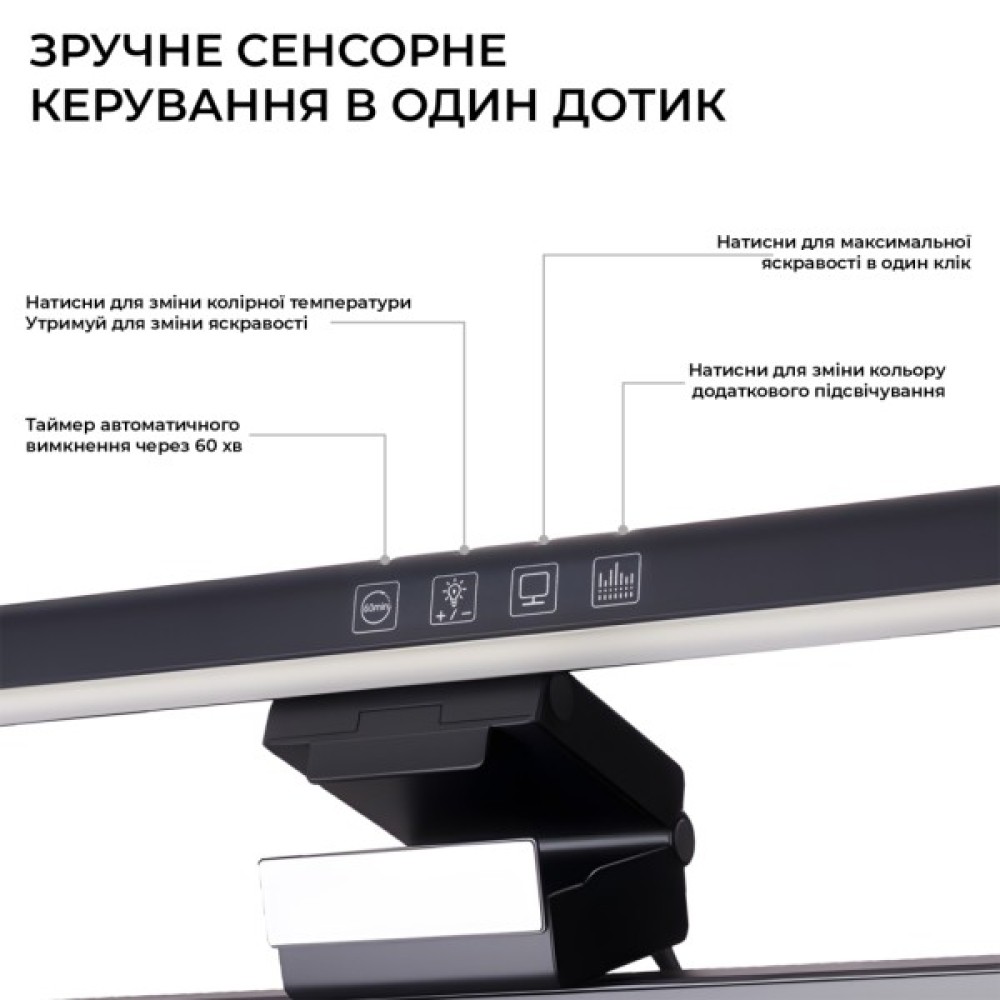 Керування всіма функціями інтуїтивно зрозуміле завдяки зручній сенсорній панелі. Один дотик дозволяє змінити колірну температуру, активувати максимальну яскравість або перемкнути кольори додаткового підсвічування. Утримуючи кнопку, ви можете плавно регулювати яскравість основного світла. Для вашого комфорту передбачено таймер автоматичного вимкнення через 60 хвилин.