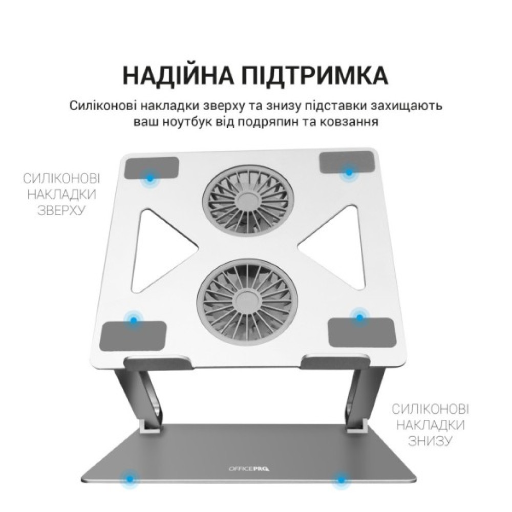Ця неймовірно стильна підставка виготовлена з високоякісного алюмінію, силікону та пластику, забезпечуючи найвищу якість і довговічність. Її антиковзкі силіконові фіксатори надійно утримують ваш ноутбук на місці, навіть під час інтенсивної роботи.