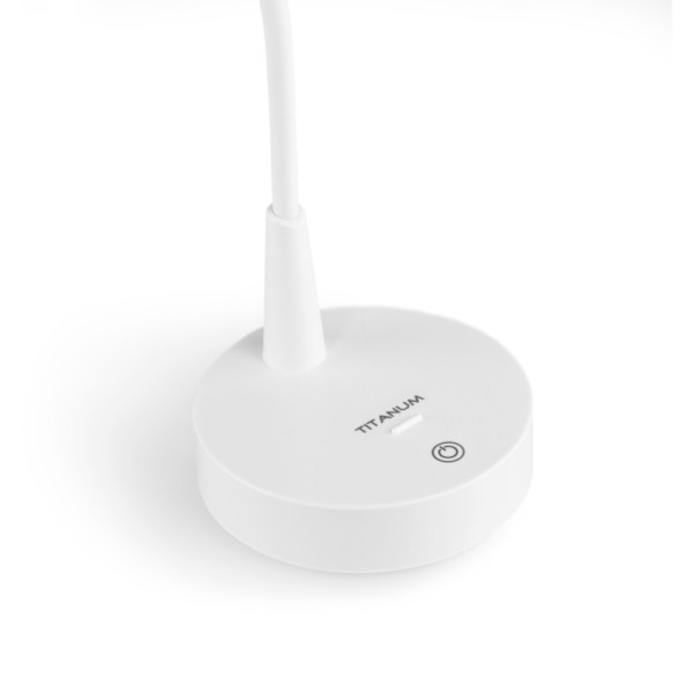LED лампа настiльна з акумулятором TITANUM TLTF-012W 7W 3000-6000K – стильна та компактна лампа з можливістю регулювання яскравості та колірності. Лампа абсолютно безшумна, має в комплекті акумулятор та тривалий термін служби. Корпус виготовлений з екологічно безпечного якісного пластику білого кольору. Рухома конструкція ніжки лампи дозволяє скеровувати світло у потрібному напрямку. Розрахована для освітлення письмового чи робочого столу. Реалізована можливість регулювання яскравості та зміни колірності світла, що сприяє зменшенню навантаження на зір. Керування лампою здійснюється за допомогою сенсорної кнопки, розташованої на її корпусі. Додатково лампа слугує також в якості підставки для смартфона. Для цього на корпусі є спеціально відведене місце з бортиком.