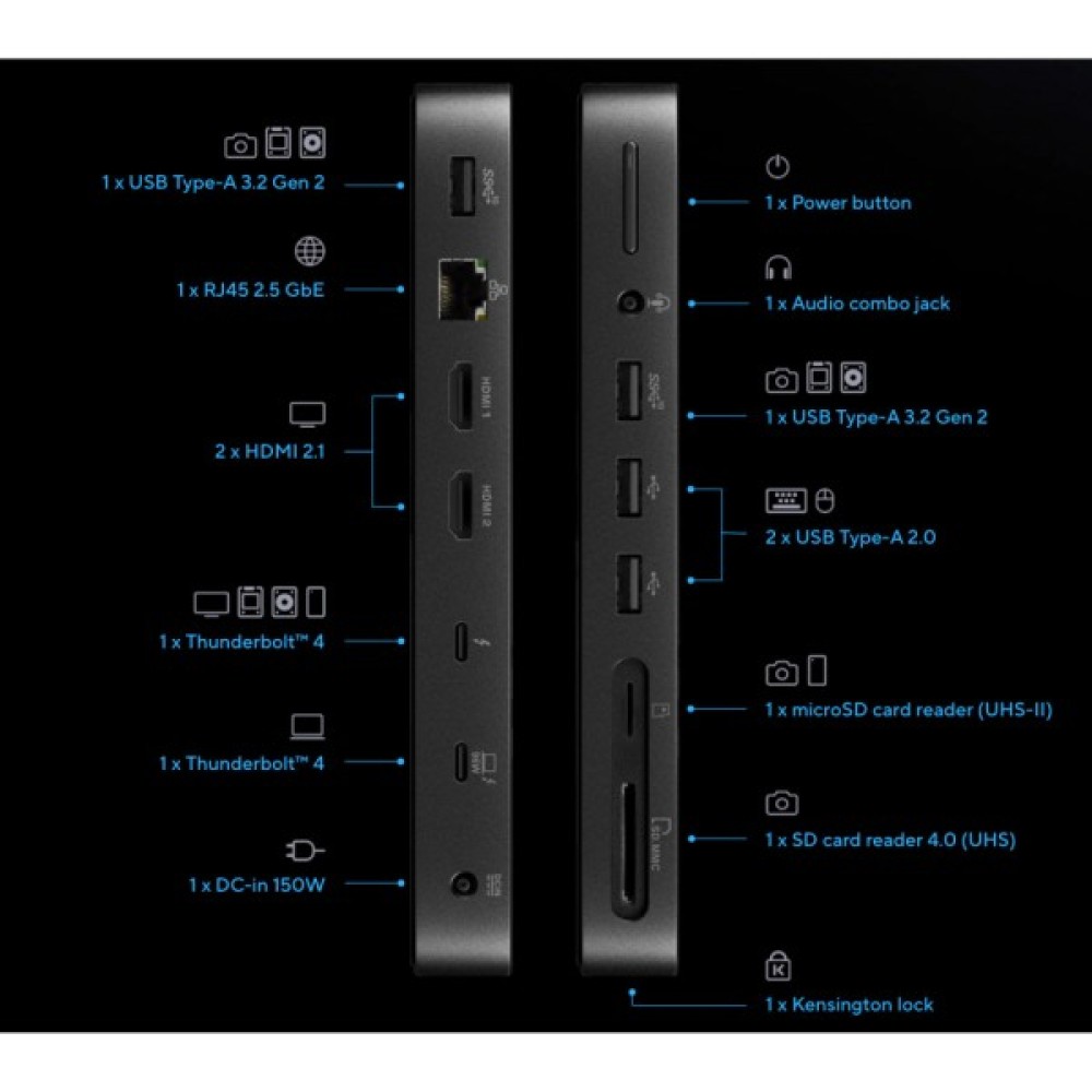 Kensington Lock Slot; SD кардридер; microSD кардрідер; 1 x ThunderBolt 4; 2 x USB 3.2; 2 x USB 2.0; 2 x HDMI; AUX (3.5 мм); RJ-45