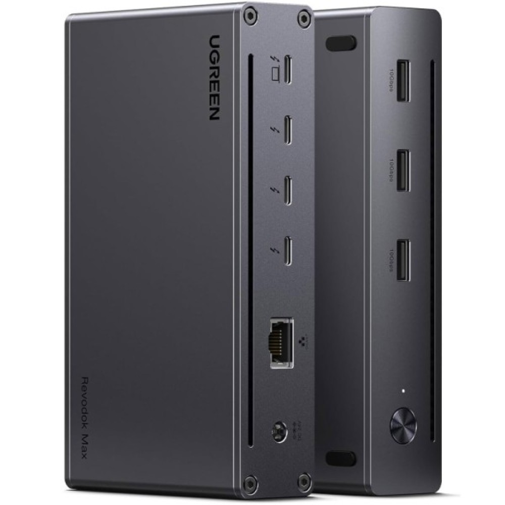 Три порти USB-A 3.2 Gen 2 дозволяють підключати периферійні пристрої зі швидкістю до 10 Гбіт/с, а RJ45 Gigabit Ethernet забезпечує стабільне інтернет-з'єднання. Док-станція також підтримує зарядку ноутбука до 85 Вт та живлення підключених пристроїв через вхідний адаптер 140 Вт.
