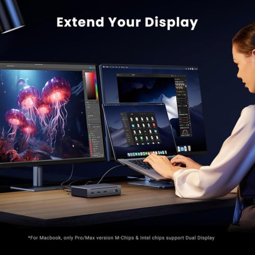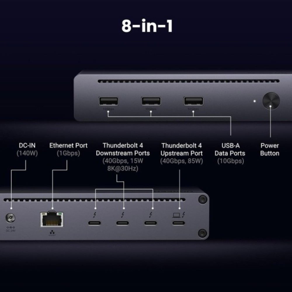 Док-станція Ugreen U708 Thunderbolt 4 8-в-1 значно розширює можливості вашого ноутбука чи ПК. Завдяки підтримці Thunderbolt 4 вона забезпечує швидкість передачі до 40 Гбіт/с і підтримує виведення відео у 8K@30Hz або 4K@60Hz на два дисплеї.