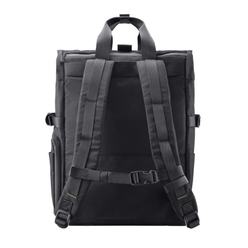 Для зберігання пляшок, парасольок або штативів передбачені функціональні ремені збоку та знизу, а регульований нагрудний ремінь знижує навантаження на плечі під час тривалого носіння.