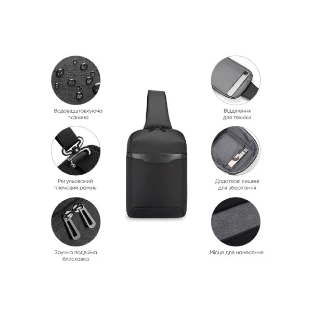 Рюкзак на одне плече PORTO RNC-4045BK буде зручним аксесуаром для зберігання та транспортування невеликих мобільних гаджетів типу планшета, повербанки, зарядних пристроїв тощо.