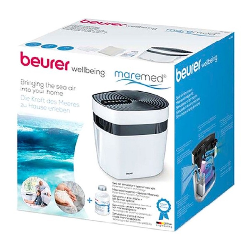 Кліматичний комплекс Beurer Maremed MK 500. Система працює з додаванням спеціальної морської солі, яка має природне походження та містить 65 мікроелементів. Чисте морське повітря сприяє спокійному сну та покращує загальне самопочуття. Людям, які страждають на астму, алергію, респіраторні захворювання — морський клімат забезпечує чимале полегшення симптомів. Вміст солі та мінералів особливо корисний для дихальних шляхів. Інноваційний пристрій для створення морського клімату. Сучасна технологія очищення, мінералізації, стерилізації, іонізації та зволоження повітря. Фільтри очищають повітря, видаляючи понад 70% частинок бруду, пилу, дрібного сміття, шерсть, пилок.