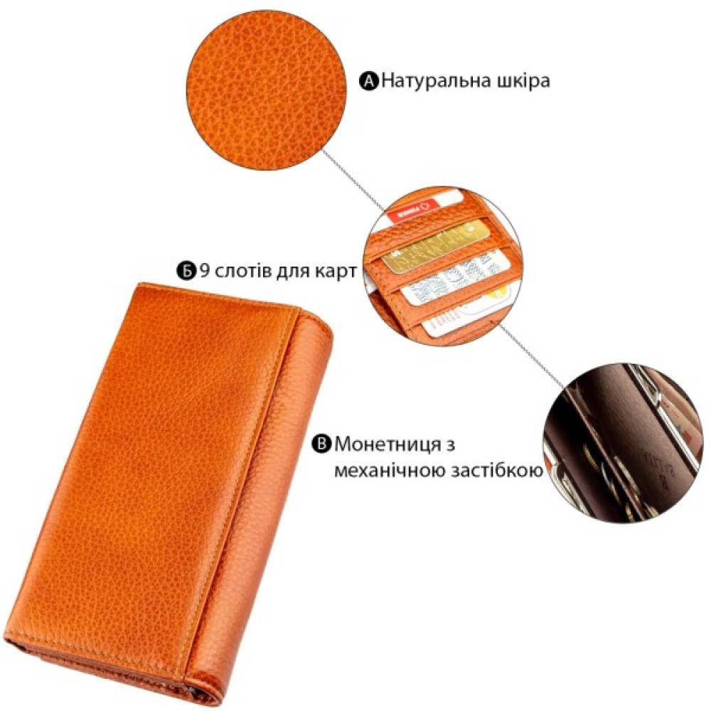 Гаманець горизонтальний жіночий шкіряний BALIYA 18980 у помаранчевому кольорі виготовлений із натуральної шкіри, що забезпечує довговічність та приємні тактильні відчуття. Його розміри становлять 18 см завширшки, 9,5 см заввишки та 2 см завтовшки, що робить його зручним для щоденного використання. Виробництво здійснюється в Китаї.