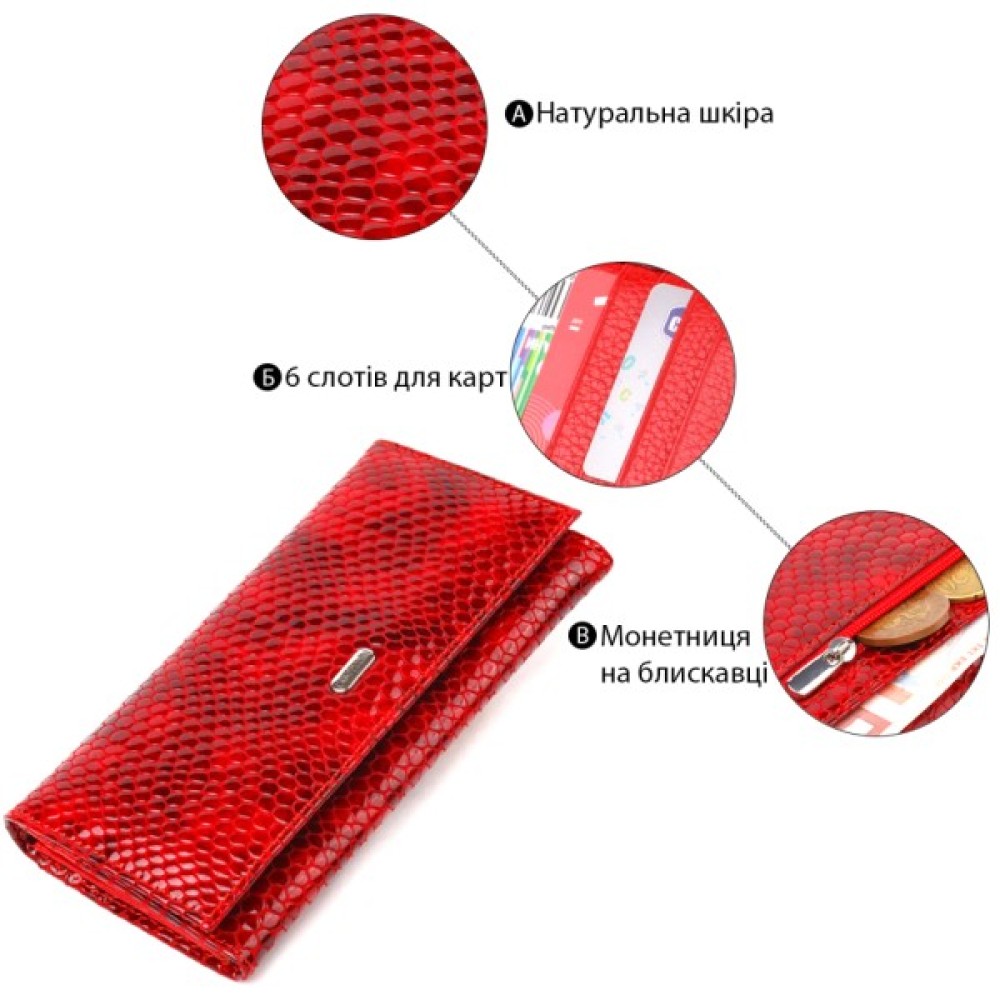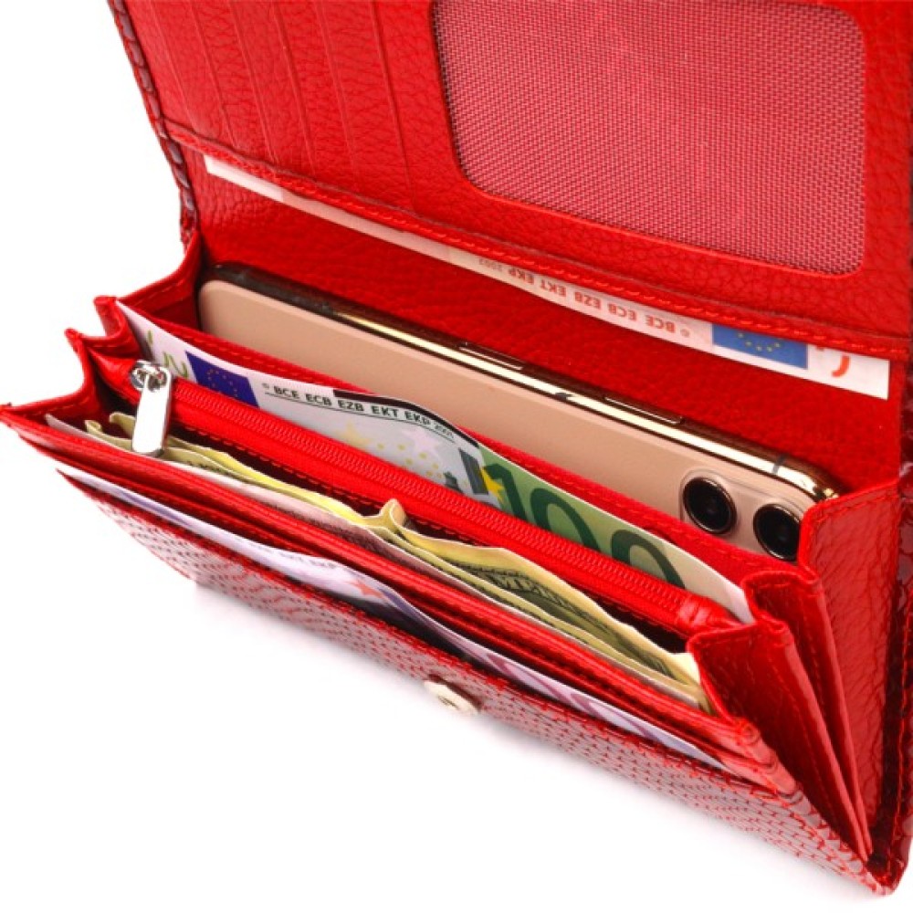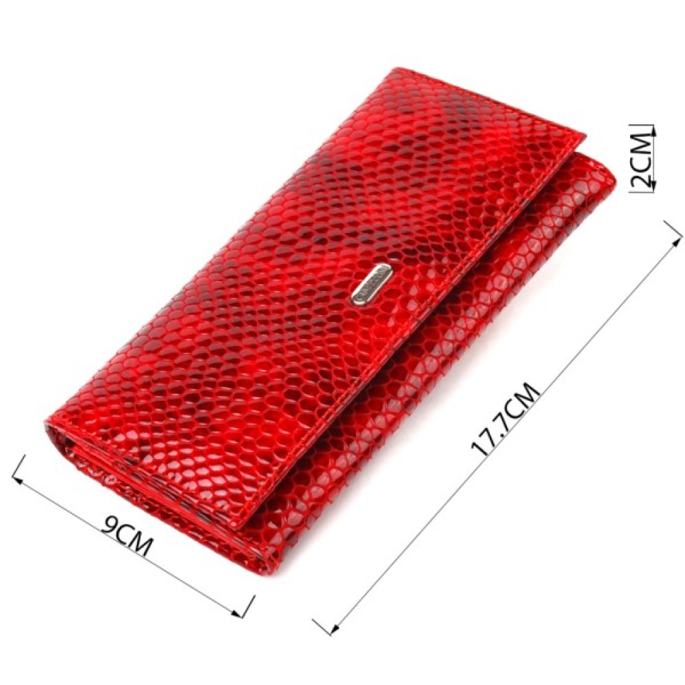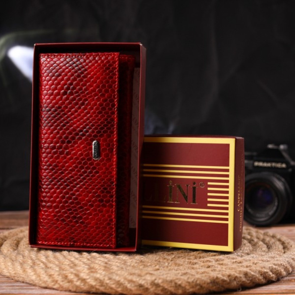 Жіночий яскравий гаманець з натуральної фактурної шкіри з тисненням під змію. Аксесуар має три широкі відділення для купюр з двома перегородками (одна з них на блискавці), містку зовнішню монетницю, чотири приховані кишені та шість кишень для карток, включаючи одну під сіточкою. Закривається аксесуар клапаном на кнопку