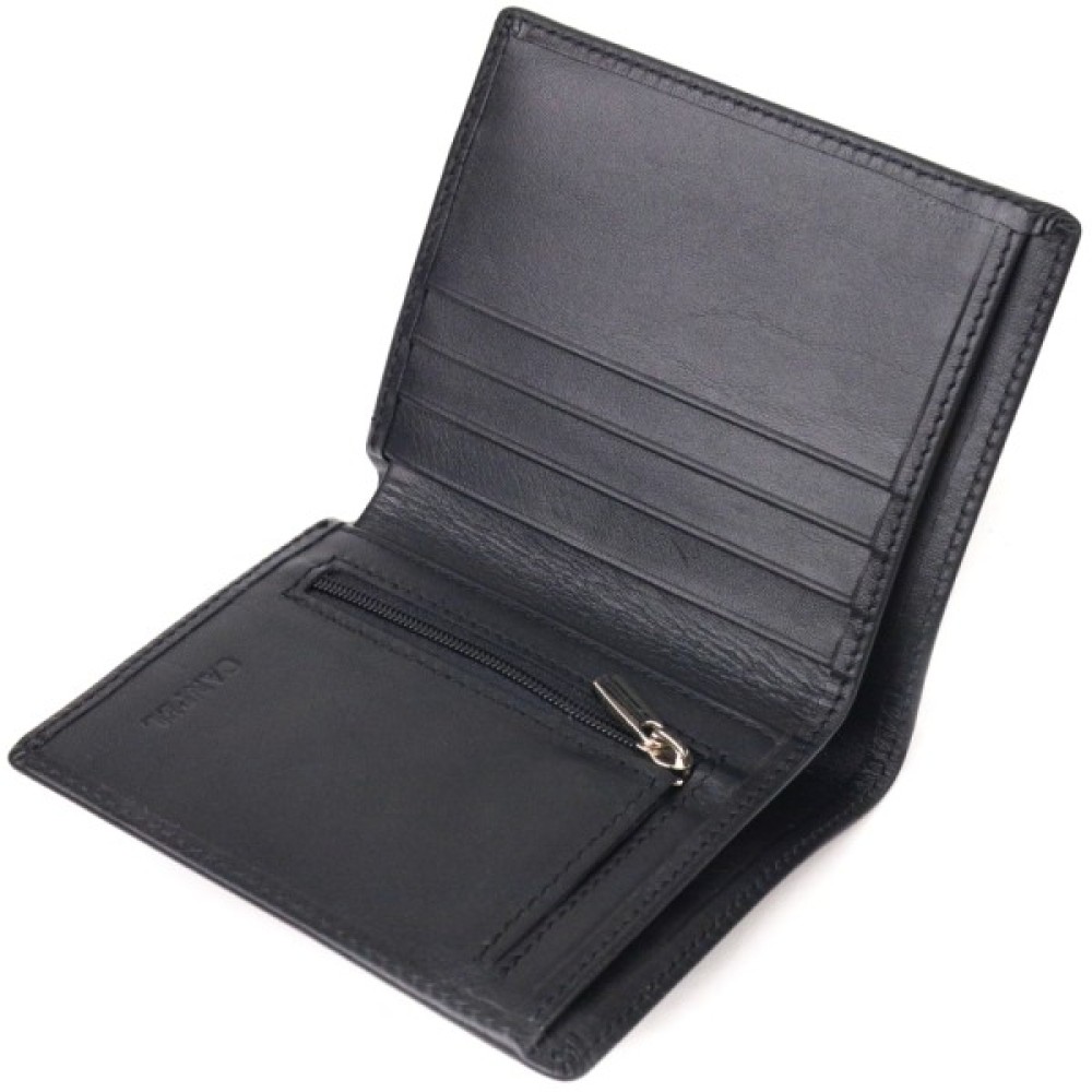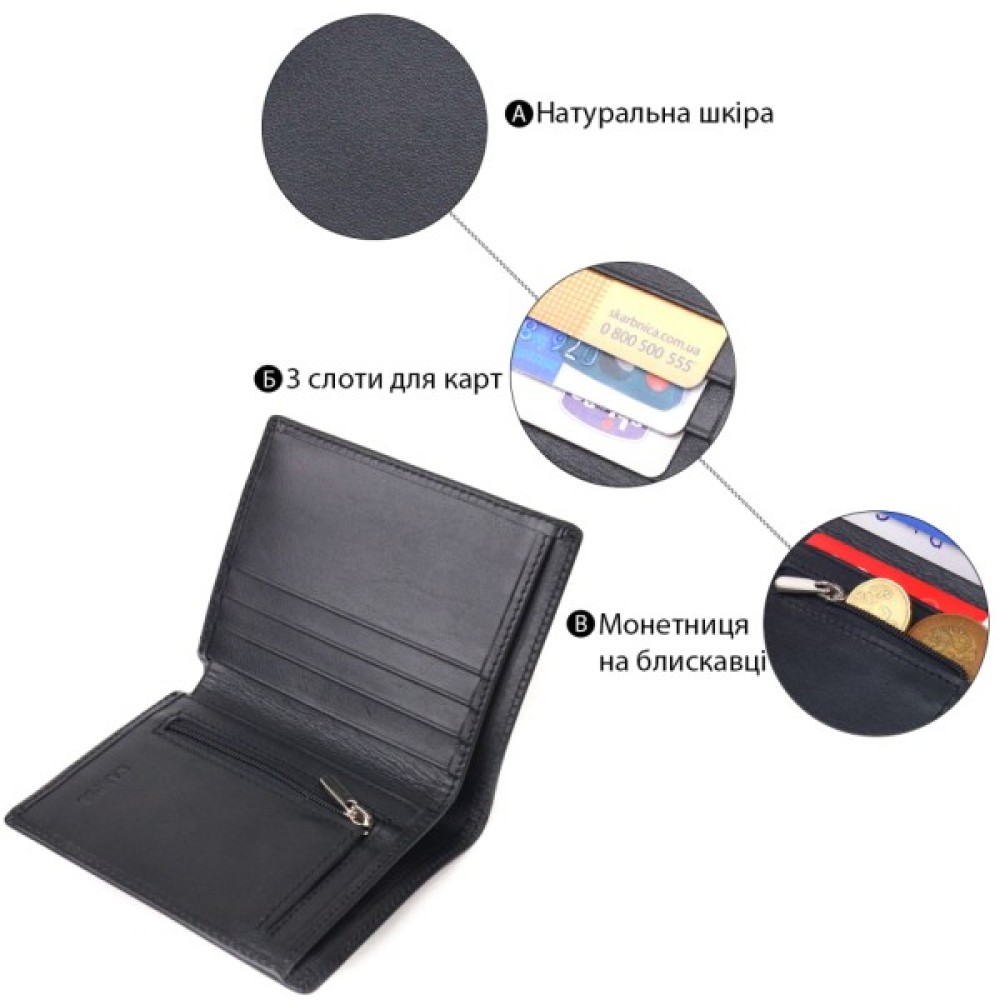 Надійне чоловіче портмоне з натуральної гладкої шкіри у класичному чорному кольорі. Аксесуар має одне основне відділення з перегородкою, у яке поміщаються купюри всіх номіналів, три відсіки для карток, монетницю на блискавці з розширювачем, два прилеглі кишені. На зовнішній стороні — металевий логотип виробника. Колір фурнітури — срібло. Шкіряний гаманець є справді потрібним та практичним подарунком.