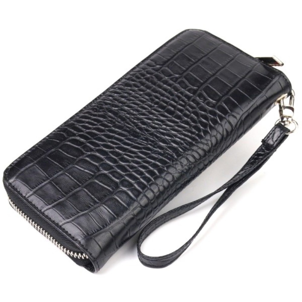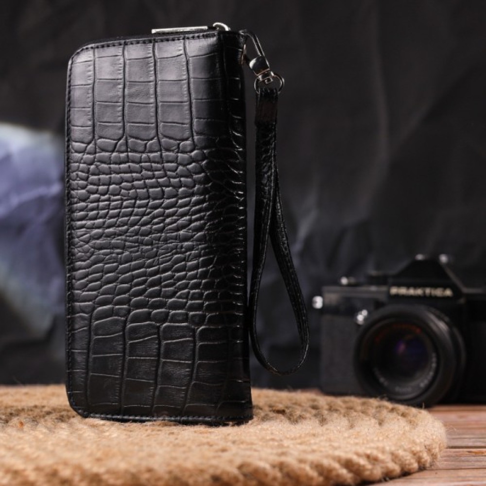 Стильний жіночий гаманець з натуральної фактурної шкіри в класичному чорному кольорі. Аксесуар має три основні відділення, в які поміщаються купюри всіх номіналів, дві перегородки, одна з яких на блискавці, вісім кишень для карток, дві прилеглі кишені та знімний кистьовий ремінь. Закривається аксесуар на блискавку.