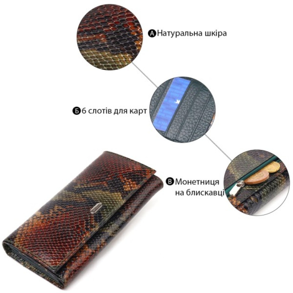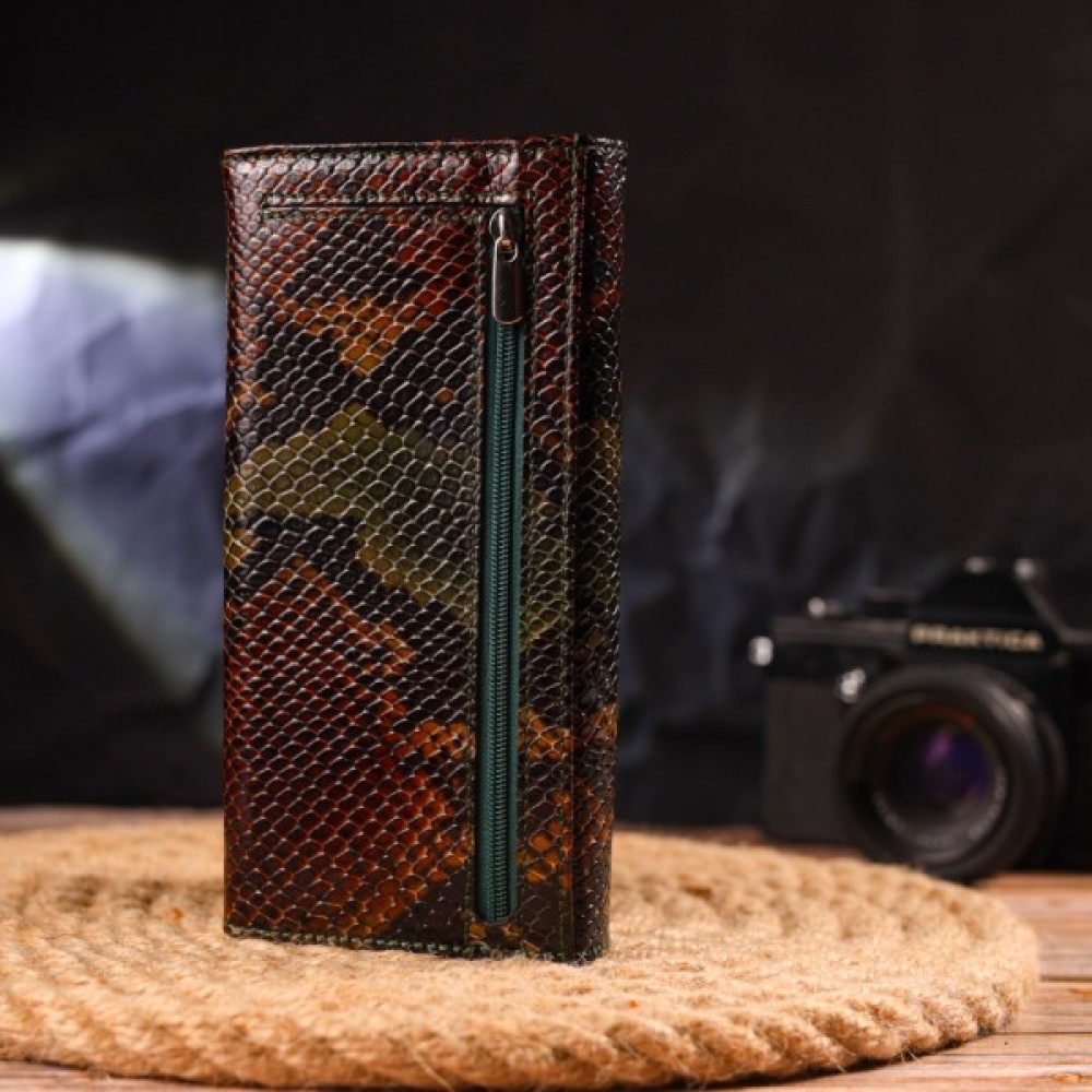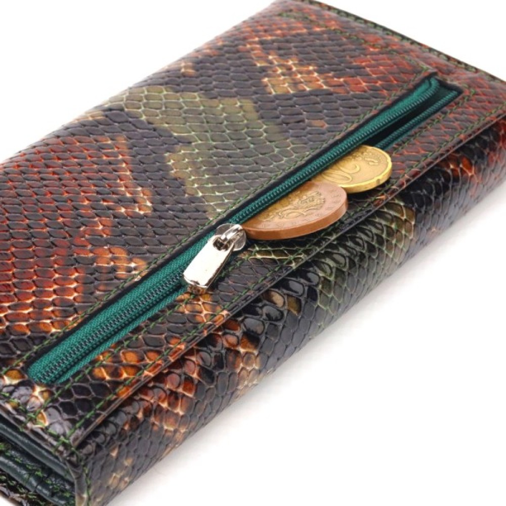 Жіночий яскравий гаманець з натуральної фактурної шкіри з тисненням під змію. Аксесуар має три широкі відділення для купюр з двома перегородками, одна з яких на блискавці, містку зовнішню монетницю, три приховані кишені та шість кишень для карток.