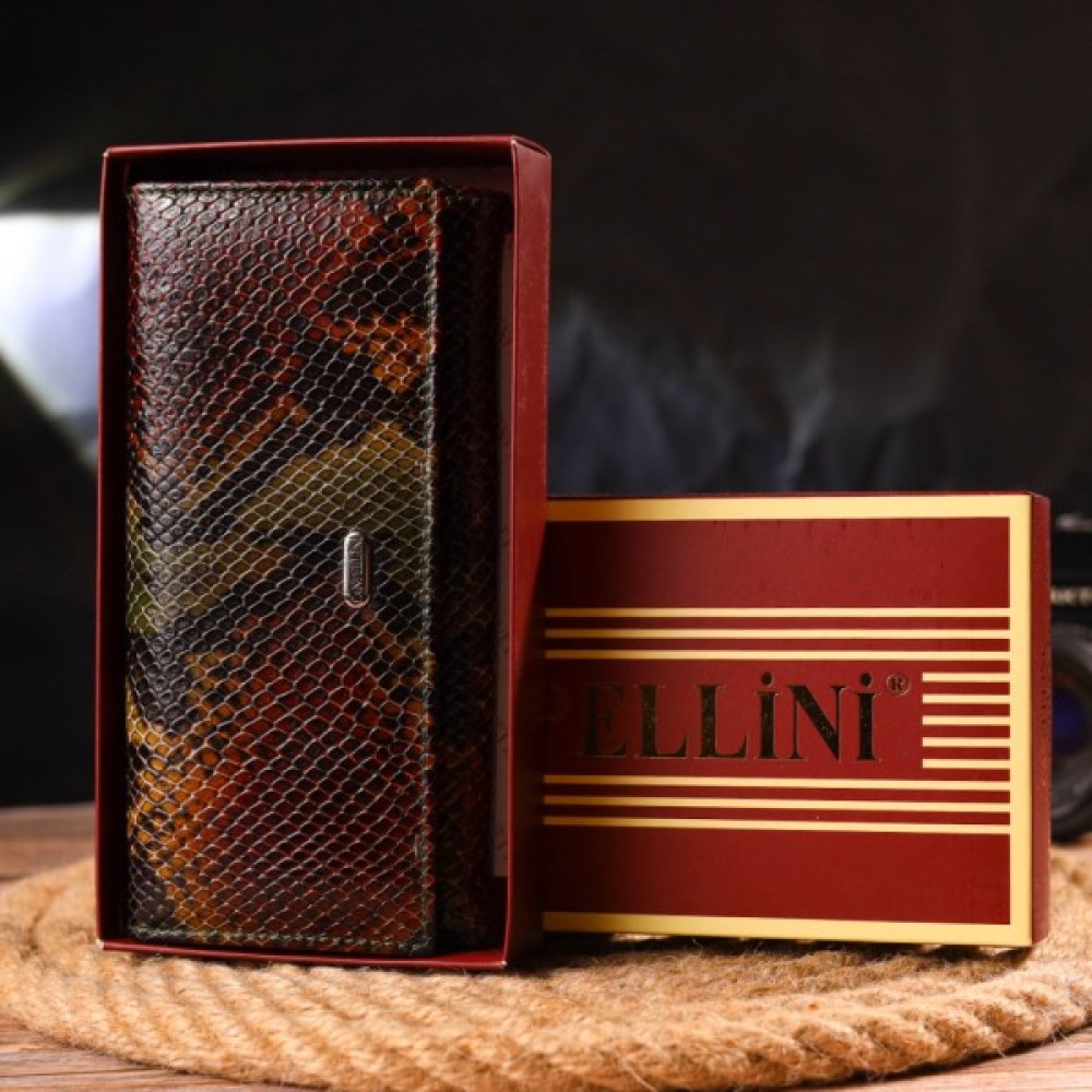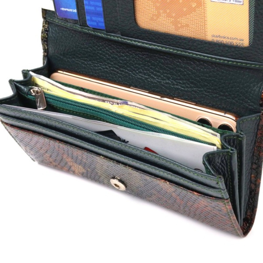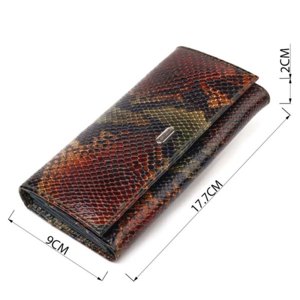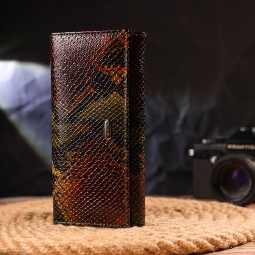 Жіночий яскравий гаманець з натуральної фактурної шкіри з тисненням під змію. Аксесуар має три широкі відділення для купюр з двома перегородками, одна з яких на блискавці, містку зовнішню монетницю, три приховані кишені та шість кишень для карток.
