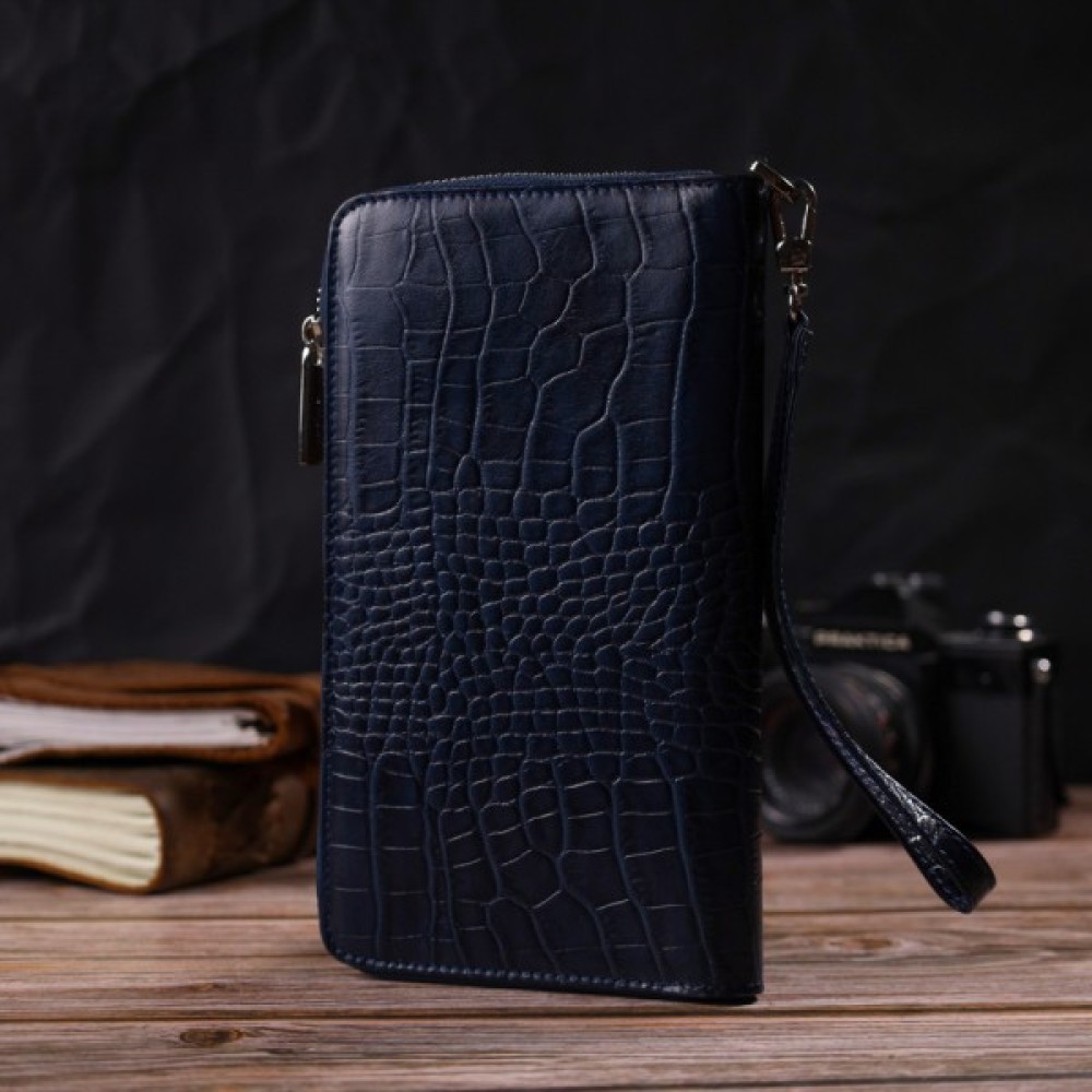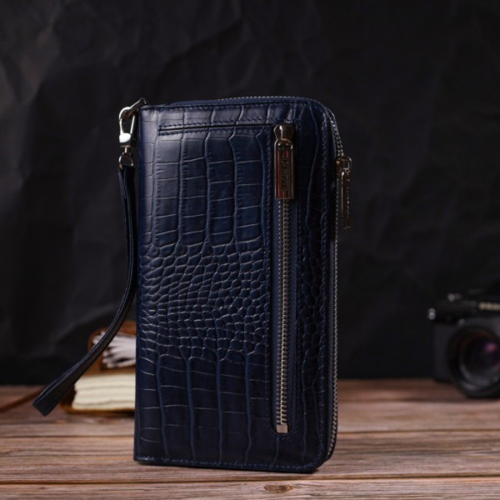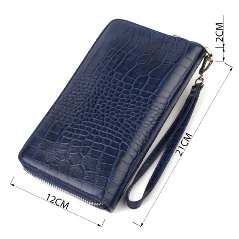 Відмінний та зручний жіночий клатч із натуральної фактурної шкіри з тисненням під крокодила. Аксесуар має велике відділення для купюр, 15 осередків для карток (один під сіточкою), кишеню-перегородку на блискавці, три прилеглі кишені, зовнішню кишеню на блискавці з розширювачем та утримувач для ручки.