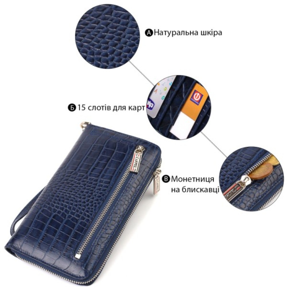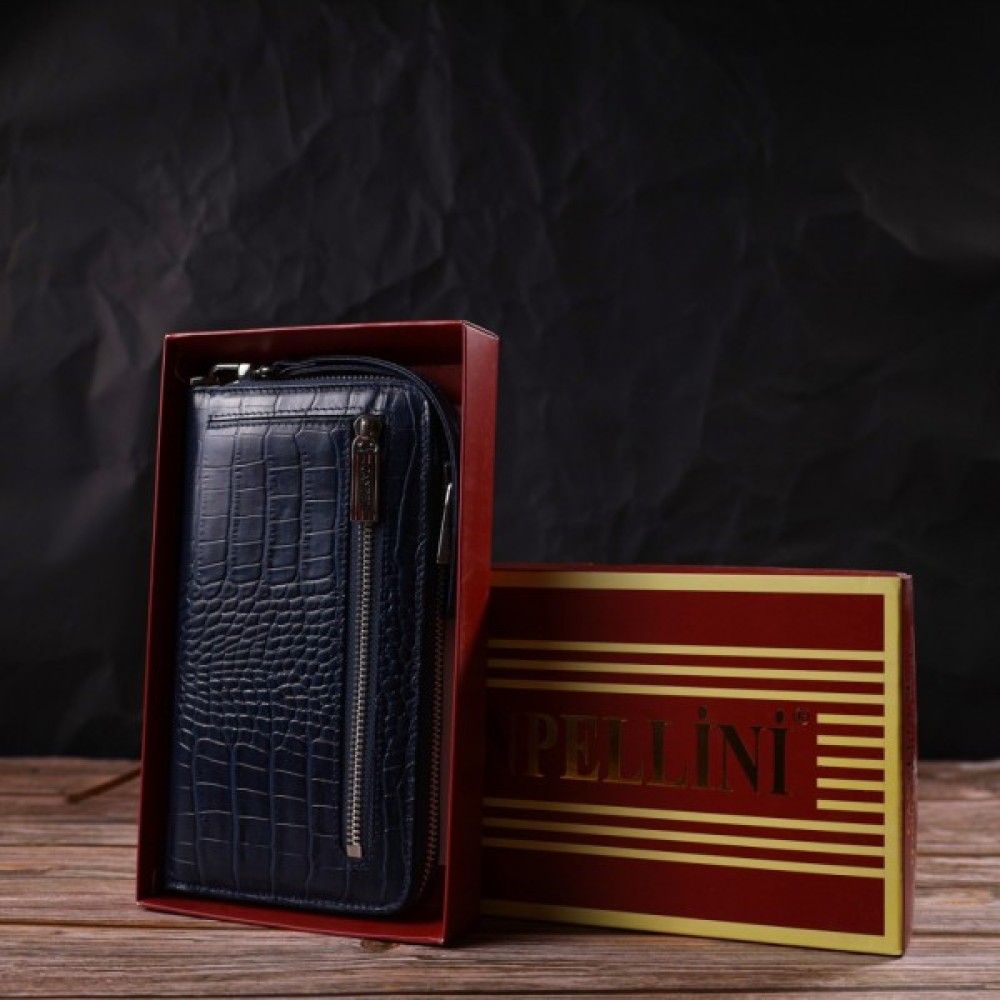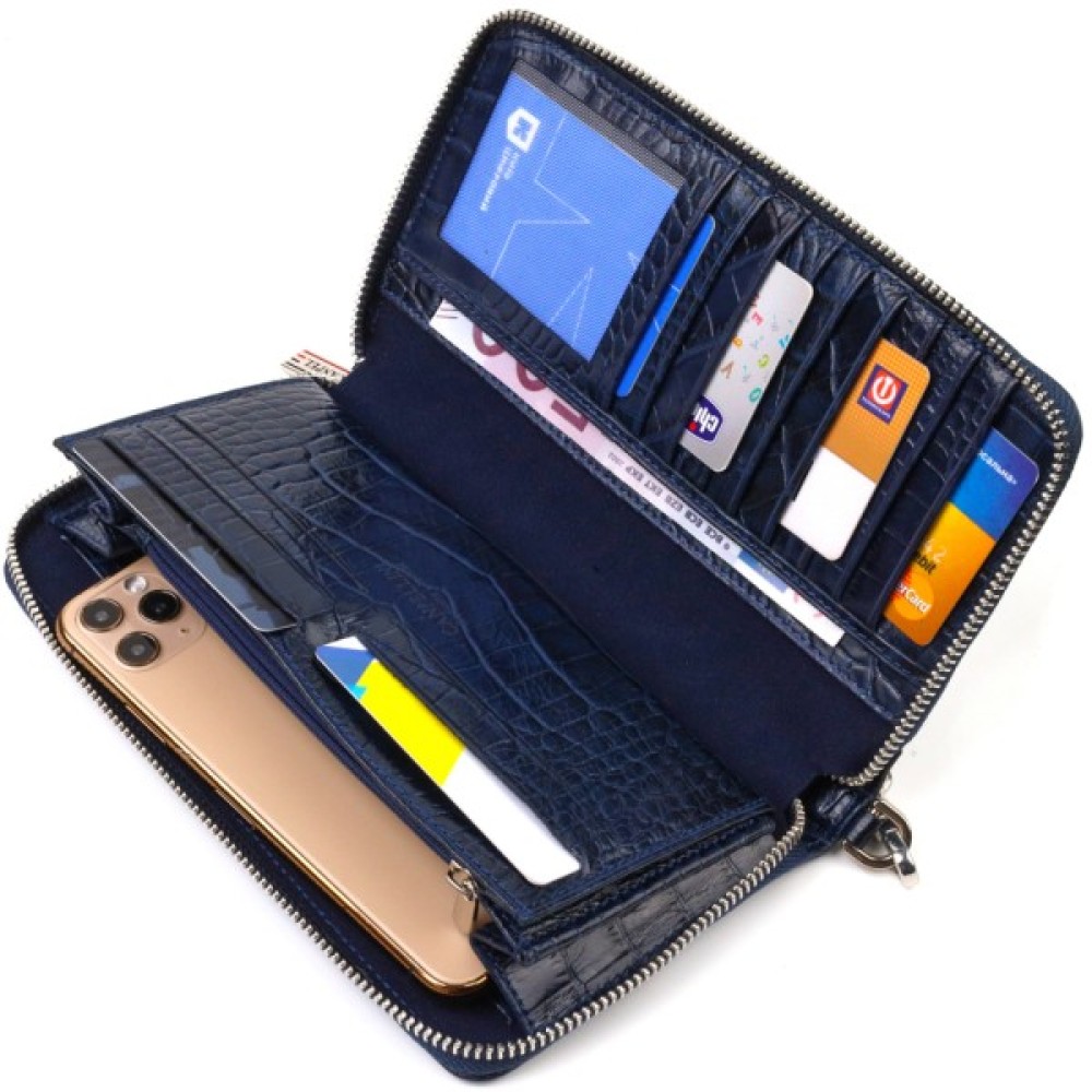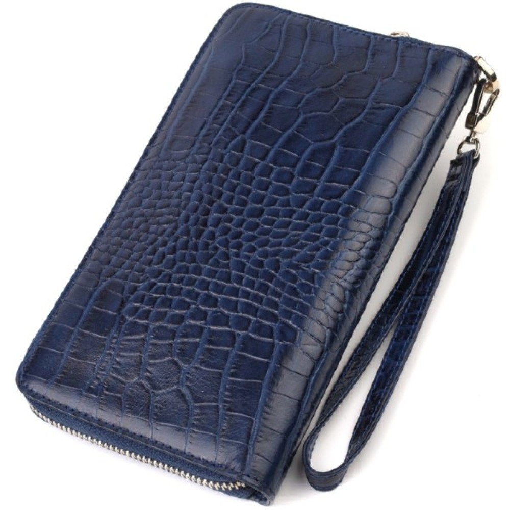 Відмінний та зручний жіночий клатч із натуральної фактурної шкіри з тисненням під крокодила. Аксесуар має велике відділення для купюр, 15 осередків для карток (один під сіточкою), кишеню-перегородку на блискавці, три прилеглі кишені, зовнішню кишеню на блискавці з розширювачем та утримувач для ручки.