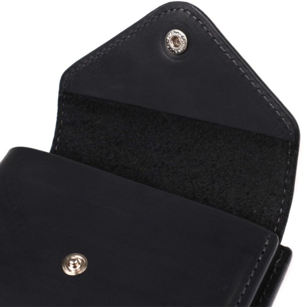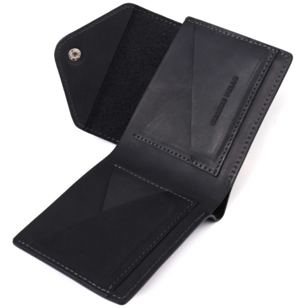Невелике горизонтальне портмоне, виготовлене тільки з натуральної шкіри найвищої якості, без тканинної підкладки. Виріб виконаний у вінтажній шкірі, яка має підвищену міцність завдяки оригінальній фінішній обробці "крейзі хорс". Фішкою цього гаманця є трикутний клапан зверху, на який закривається аксесуар.