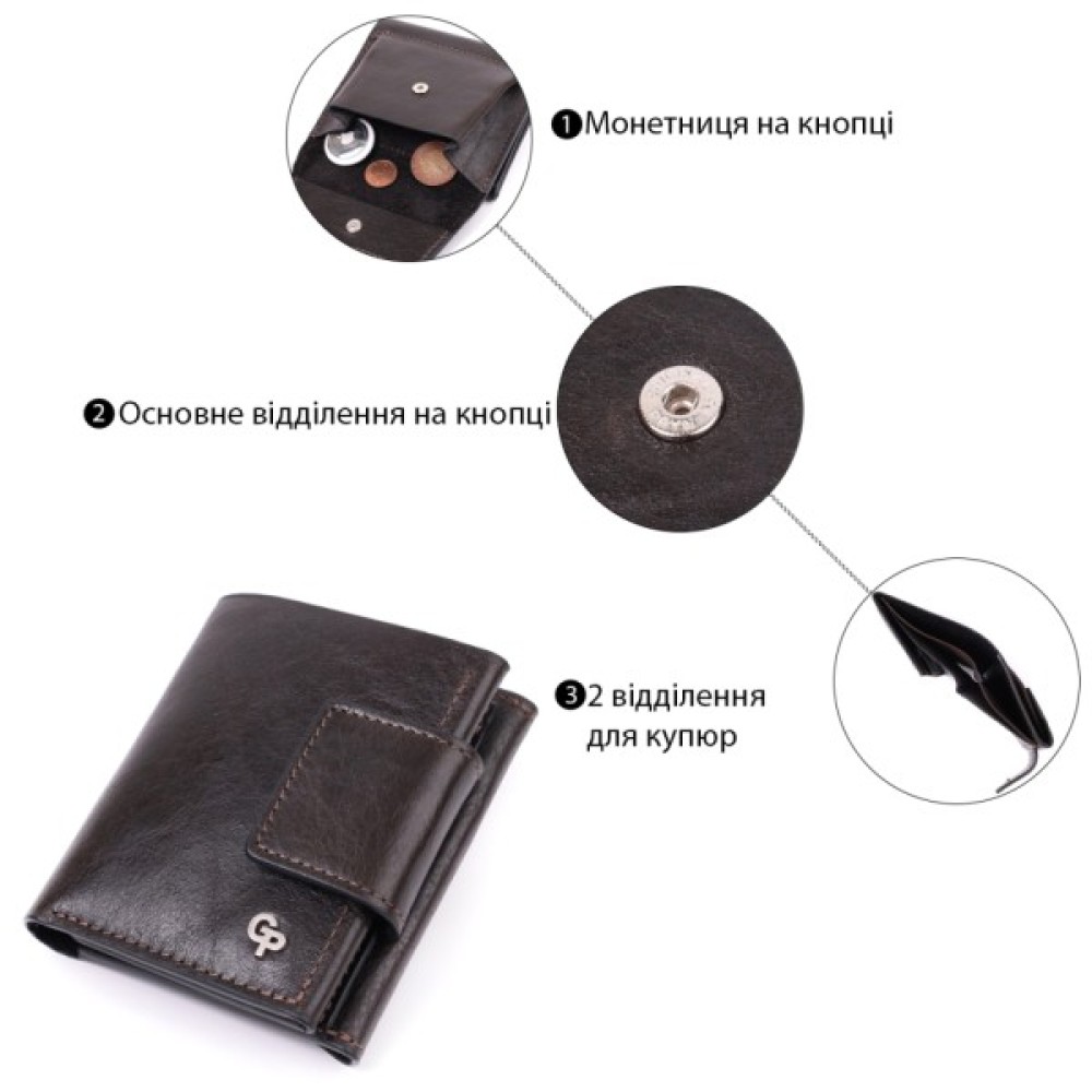 Аксесуар складається з двох відділень для купюр, семи слотів для пластикових карток, трьох потайних кишень та монетниці на тильній стороні.