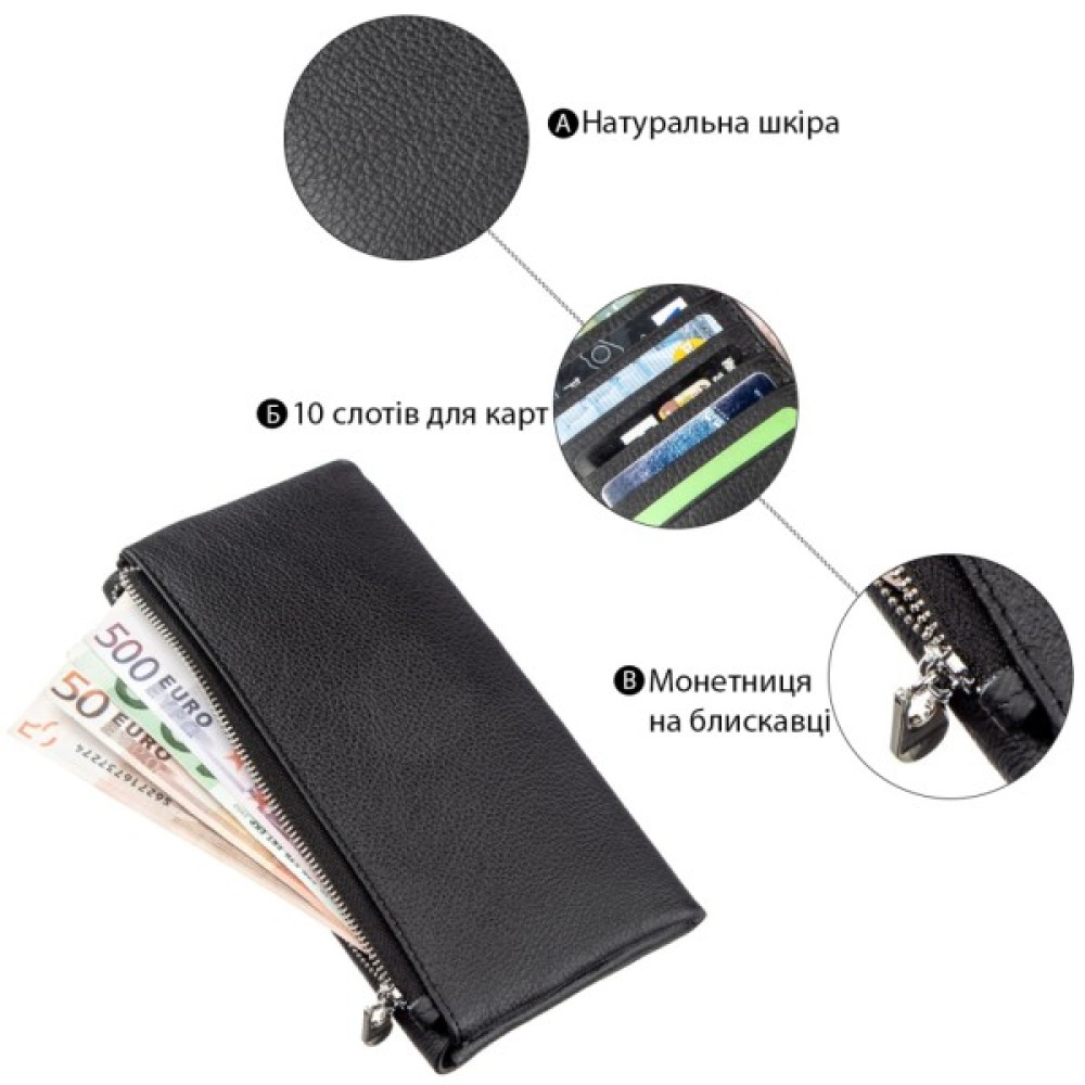 Неабиякий жіночий клатч на всі випадки життя з натуральної шкіри. Виконано в чорному кольорі, завдяки чому підійде під будь-який гардероб своєї господині.