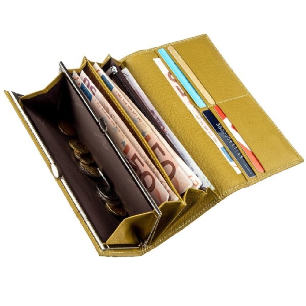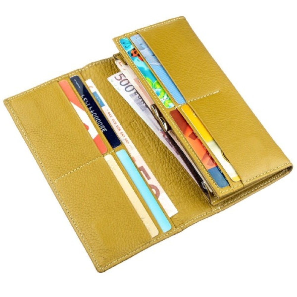 Гарний і екстравагантний жіночий гаманець незвичайного гірчичного кольору. Виконаний аксесуар з натуральної шкіри. Виглядає дуже модно і стильно. До всього цього гаманець ще й дуже практичний, тому що має всі необхідні відділення та кишені для Ваших цінностей. Всередині є три основних великих відділення для купюр, відділення на блискавці для інших цінностей, кишені для усіляких карт і зручна монетниця на металевій клямці. Також є одне зовнішнє містке відділення. Закривається цей гаманець на зручні магніти, які розташовані з боків.