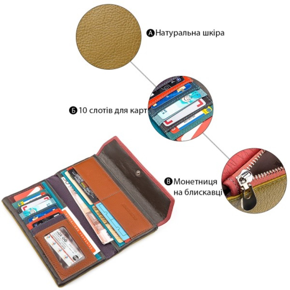 Усередині виробу є зручне відділення для купюр, а також чотири прилеглі відділи з десятьма отворами для платіжних карток.