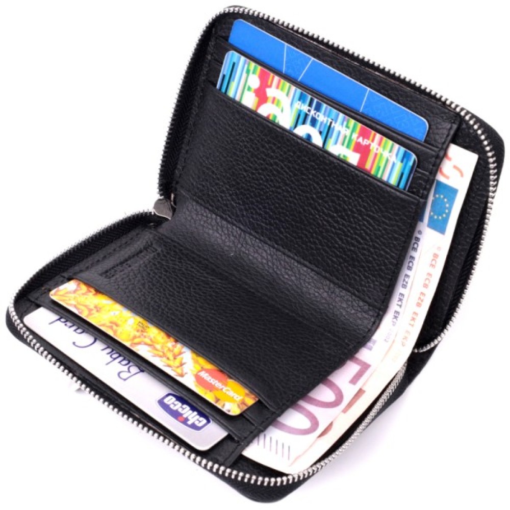 Практичний жіночий гаманець середнього розміру із натуральної шкіри найвищої якості. Аксесуар складається з двох містких відділень для купюр, шести осередків для карток, двох прихованих кишень та зовнішньої кишені на блискавці для монет.