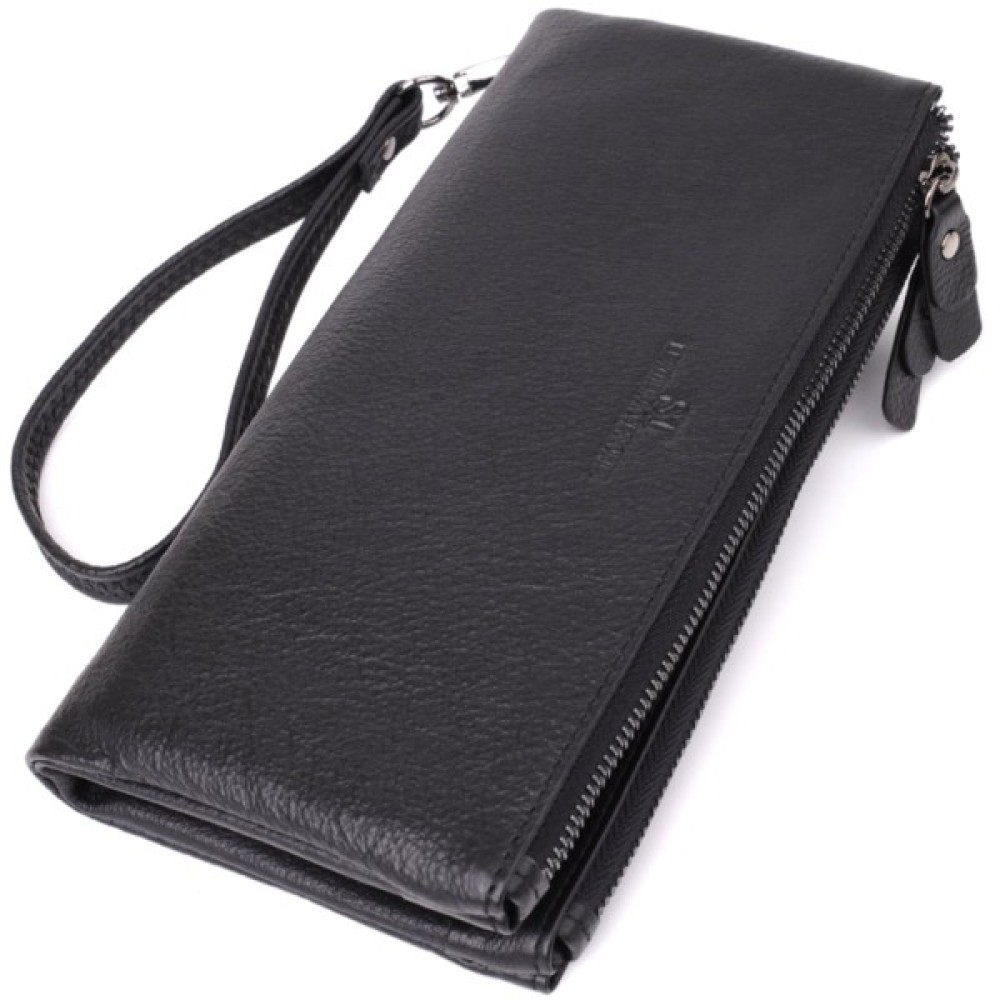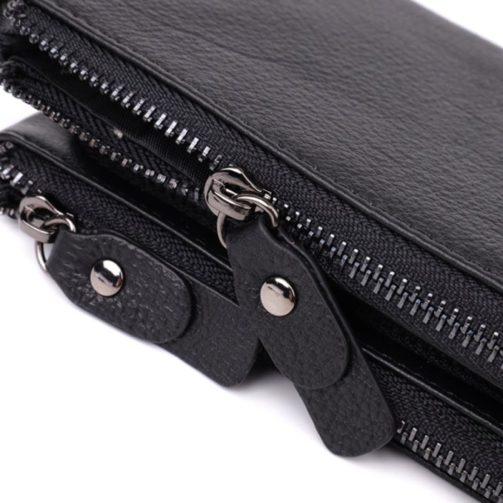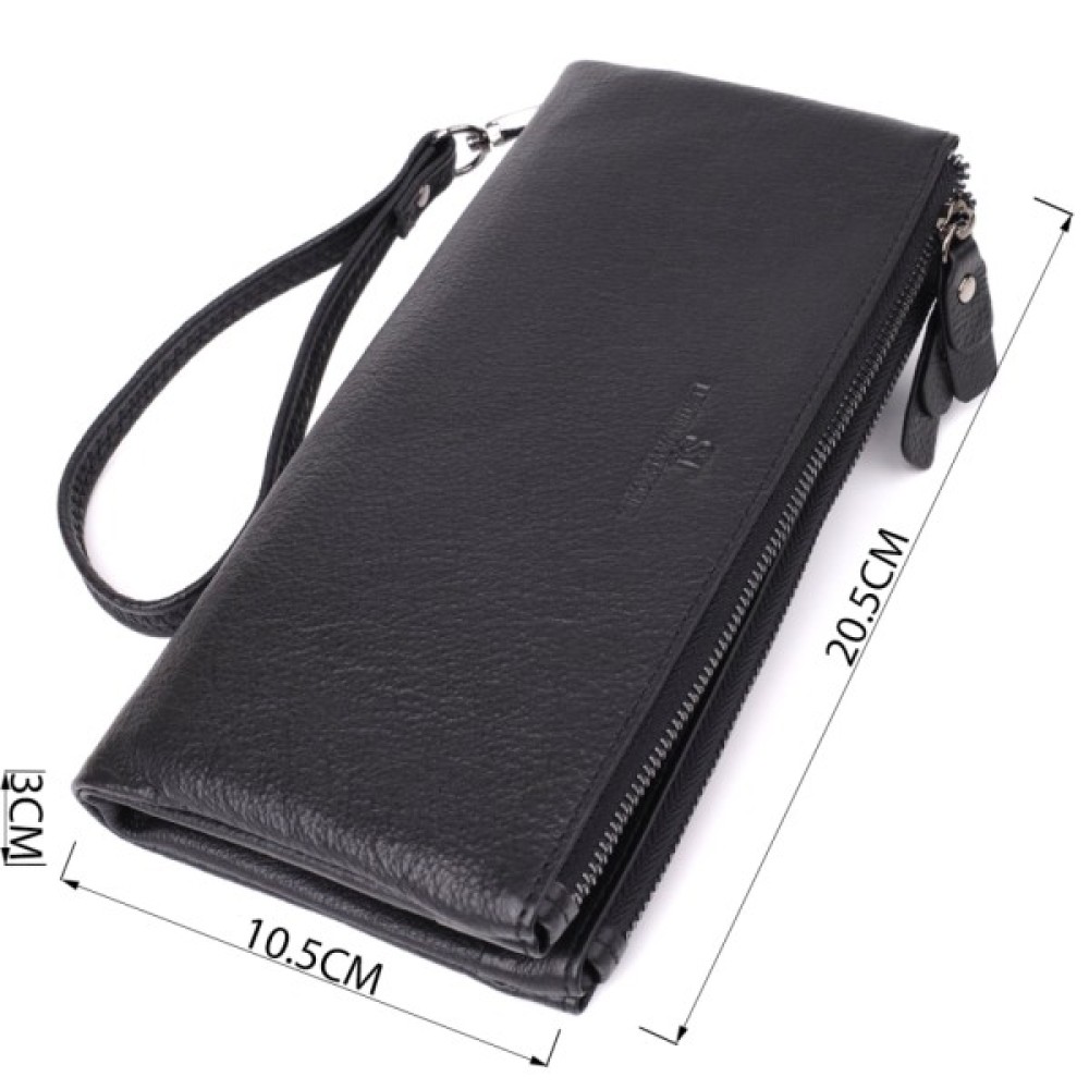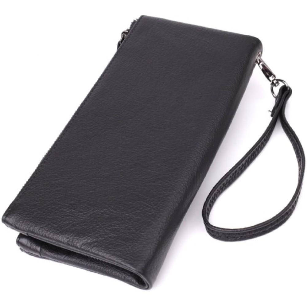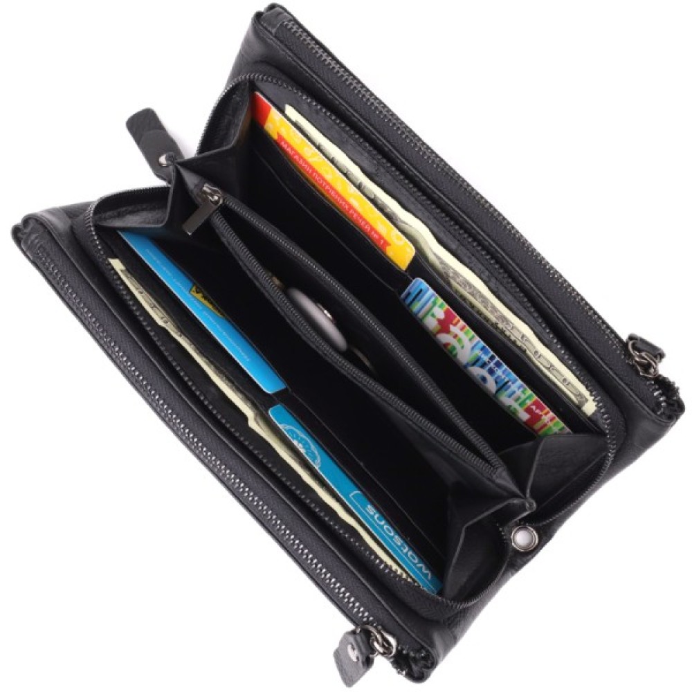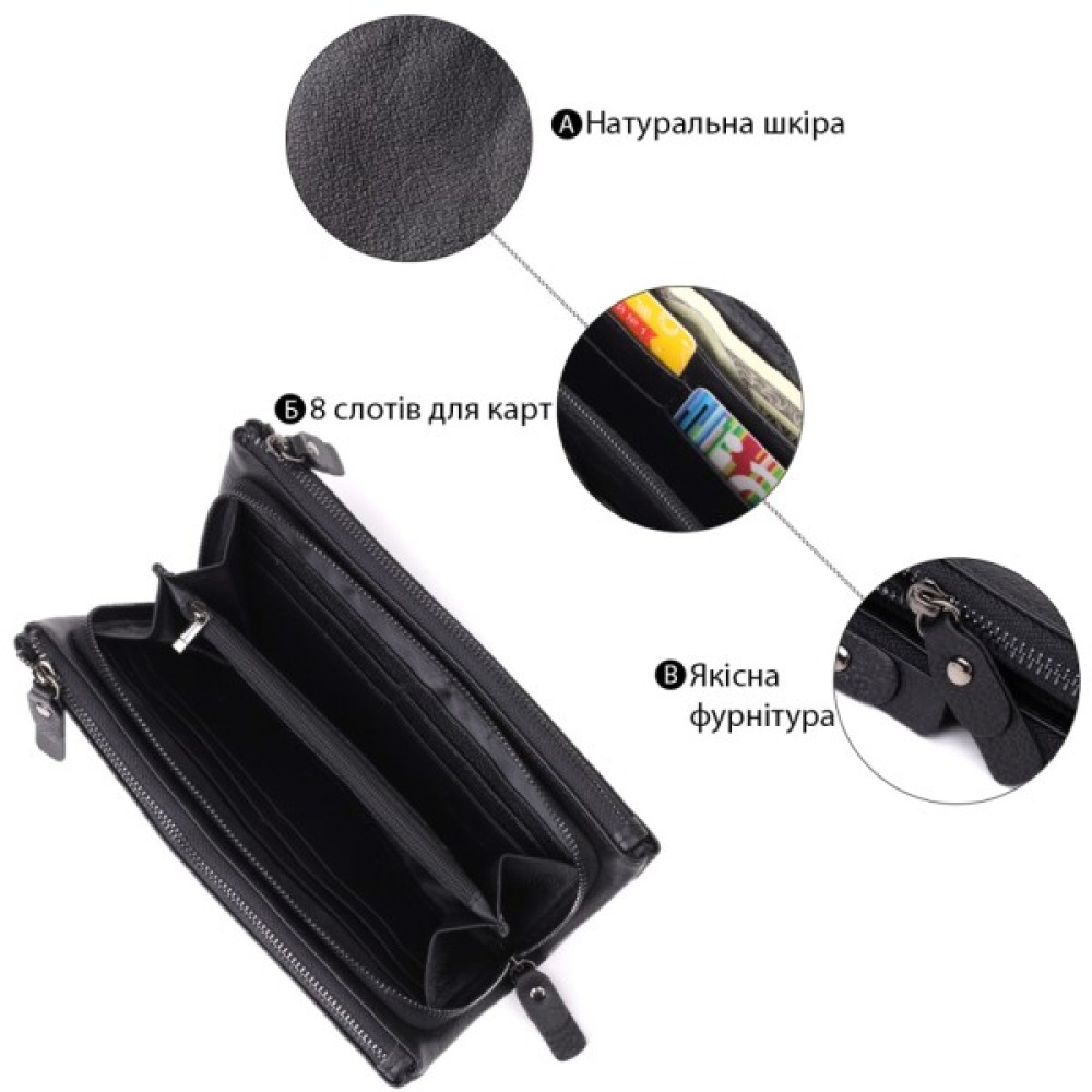 Носити клатч можна за допомогою шкіряного ремінця на зап'ястя. Дві місткі кишені допоможуть зручно розкласти гроші, а наявність слотів для карток забезпечує порядок.