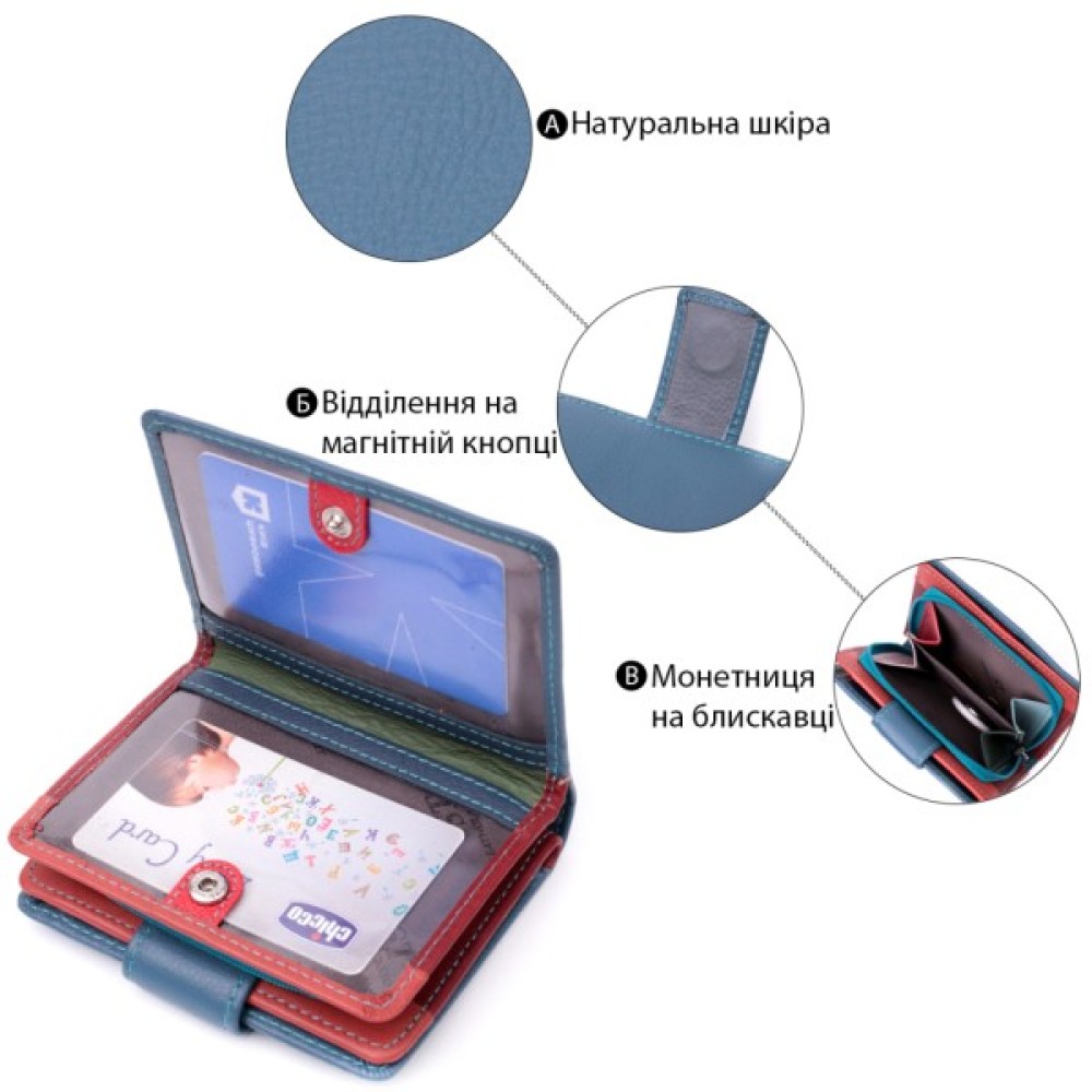 Портмоне доповнено надійною фурнітурою і акуратно прошито по краю рядком бірюзового кольору.